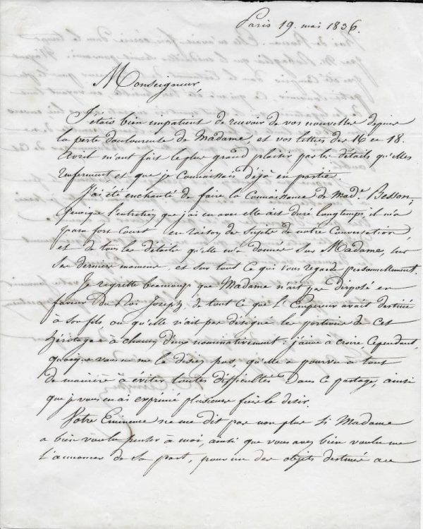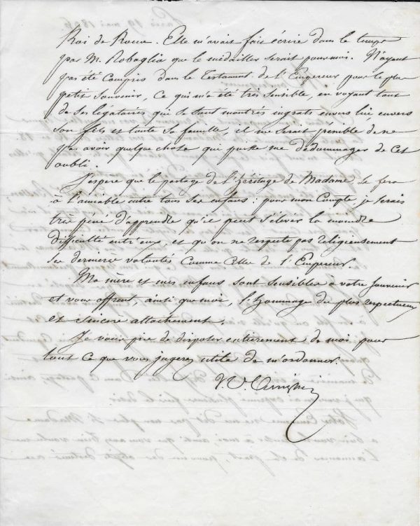 « Monseigneur, J’étais bien impatient de recevoir de vos nouvelles depuis la perte douloureuse de Madame [Laetizia Bonaparte, demi-sœur du cardinal Fesch de 12 ans son aînée], et vos lettres des 16 et 18 avril m’ont fait le plus grand plaisir par les détails qu’elles renferment et que je connaissais déjà en partie. J’ai été enchanté de faire la connaissance de Mad(am)e Besson quoique l’entretien que j’ai eu avec elle ait duré longtemps, il m’a paru fort court en raison du sujet de votre conversation et de tous les détails qu’elle m’a donnés sur Madame, sur son dernier moment, et sur tout ce qui vous regarde personnellement. Je regrette beaucoup que Madame n’ait pas disposé en faveur du roi Joseph de tout ce que l’Empereur avait destiné à son fils ou qu’elle n’ait pas désigné les portions de cet héritage à chacun d’eux nominativement : j’aime à croire, cependant, quoique vous ne me le disiez pas, qu’elle a pourvu à tous de manière à éviter toutes difficultés dans le partage, ainsi que je vous en ai exprimé plusieurs fois le désir. Votre Eminence ne me dit pas non plus si Madame a bien voulu penser à moi, ainsi que vous avez bien voulu me l’annoncer de sa part, pour un des objets destinés au Roi de Rome [le fils de Napoléon]. Elle m’avait fait écrire dans le temps par M. Robaglia que le médaillon serait pour moi. N’ayant pas été compris dans le testament de l’Empereur pour le plus petit souvenir, ce qui m’a été très sensible, en voyant tout de ses légataires qui se sont montrés ingrats envers lui, envers son fils et toute sa famille, et me serait pénible de ne pas avoir quelque chose qui puisse me dédommager de cet oubli. J’espère que le partage de l’héritage de Madame se fera à l’amiable entre tous ses enfants : pour mon compte, je serais très péné d’apprendre qu’il peut s’élever la moindre difficulté entre eux, et qu’on ne respecte pas religieusement ses dernières volontés comme celle de l’Empereur. Ma mère et mes enfants sont sensibles à votre souvenir et vous offrent, ainsi que moi, l’hommage du plus respectueux et sincère attachement. Je vous prie de disposer entièrement de moi pour tout ce que vous jugerez utile de m’ordonner… »
