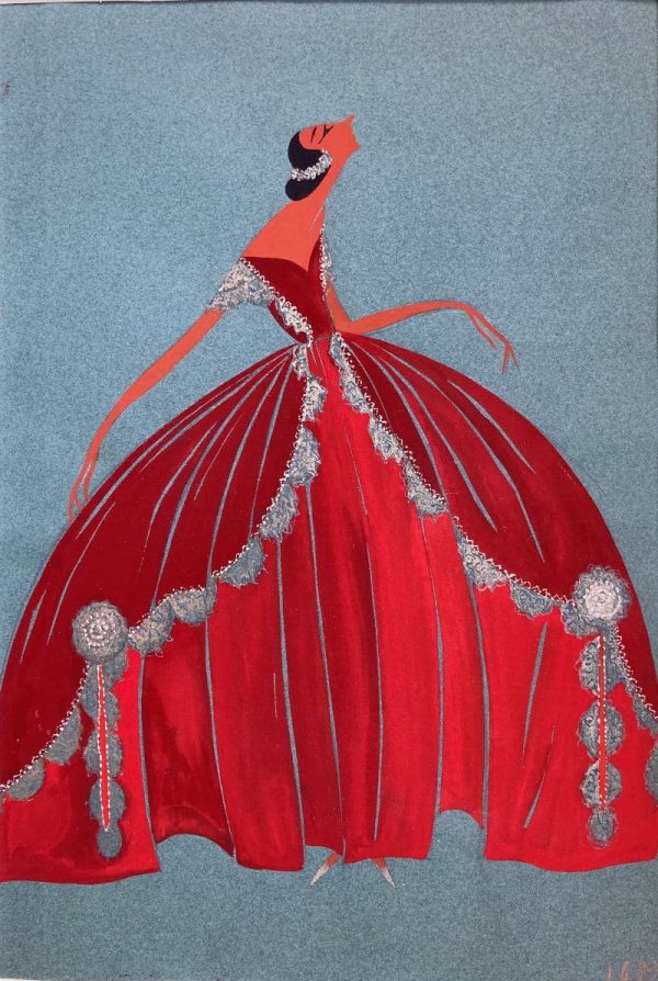 Jeanne LANVIN (1867 – 1946), couturière française, fondatrice de la maison de haute couture éponyme qui reste la plus ancienne maison de haute couture toujours en activité. La gouache présentée ici est une perfection dans les détails de la robe de haute couture magnifiée par la silhouette stylisée du mannequin typique de l’époque art déco de l’entre deux guerres.