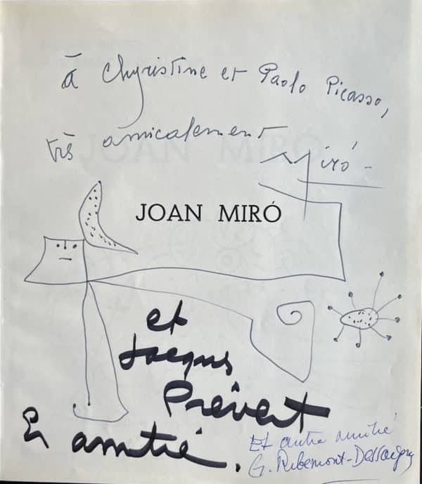 Dessin original, encre sur papier signé et dédicacé de Joan Miró à Paulo Picasso, fils de Pablo Picasso, et à son épouse Christine Pauplin. Dédicaces additionnelles au feutre de Jacques Prévert et au stylo bleu de Georges Ribemont-Dessaignes, cofondateur du mouvement dadaïste autour de Marcel Duchamp et Francis Picabia.