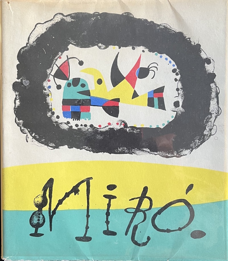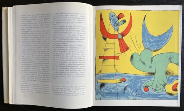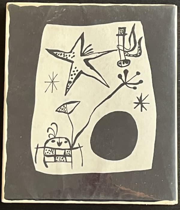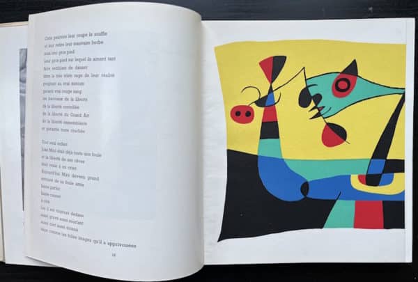 Joan Miró et Jacques Prévert : JOAN MIRÓ. Texte de Jacques Prévert et Georges Ribemont-Dessaignes, œuvres de Joan Miró. Paris, Maeght éditeur, 1956. Volume in-4 (23 x 20 cm) broché, 220 pages, reliure de l’éditeur en plein cartonnage souple, dos lisse, sous couverture illustrée rempliée, rhodoïd original. Édition originale consacrée à l’œuvre de Joan Miró. Poèmes de Jacques Prévert et de Georges Ribemont-Dessaignes ayant également rédigé l’essai sur l’artiste espagnol. Livre comprenant 6 lithographies en couleurs dont 2 originales.
