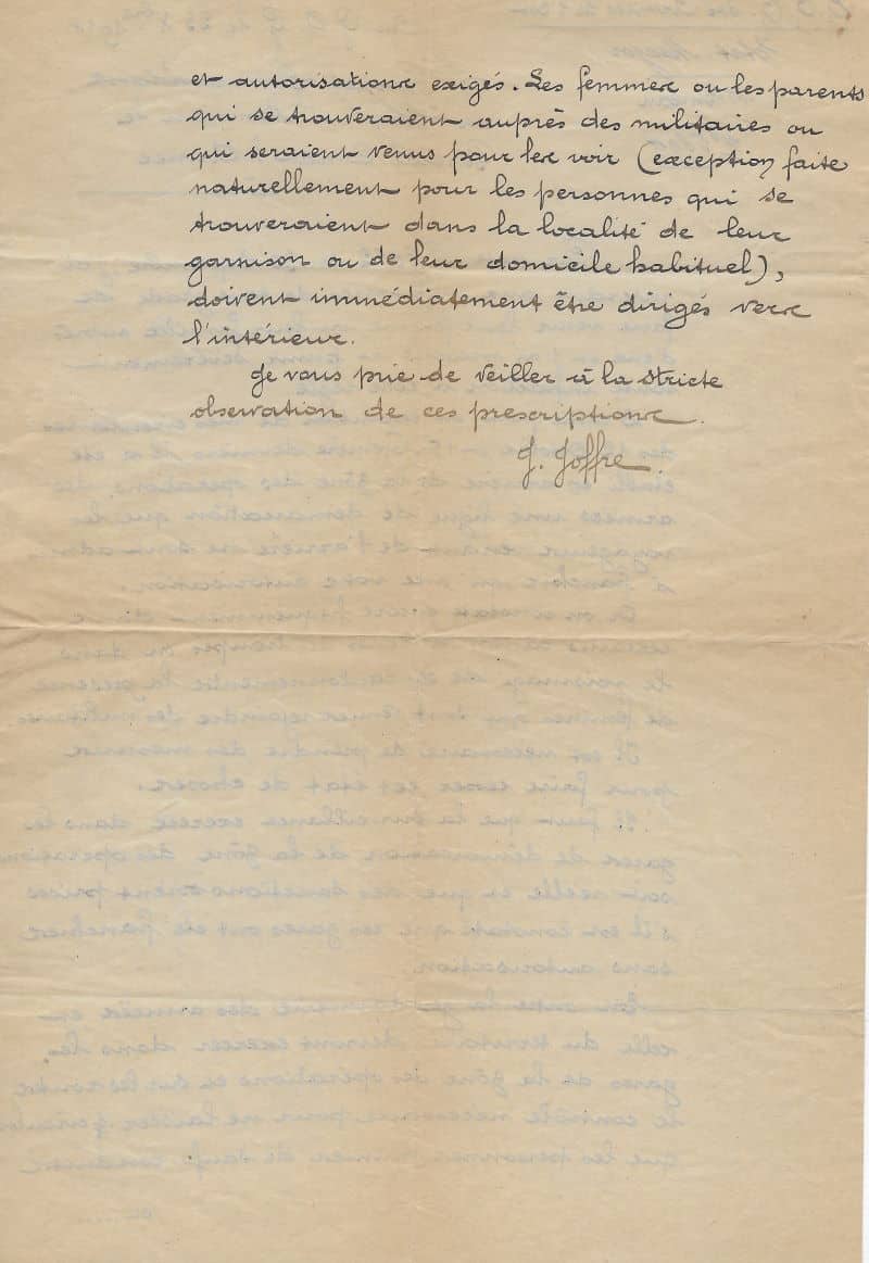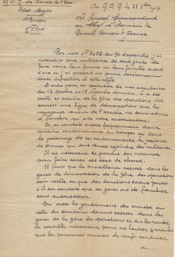 Note du général Joffre à l’encontre des unités sur les sanctions encourues quant à la présence des femmes et famille des soldats sur le front : « Par note N°8052 du 30 septembre, j’ai interdit aux militaires de tout grade de faire venir leur femme ou leur famille auprès d’eux et j’ai prescrit de punir sévèrement toute infraction à cette règle. D’autre part, en exécution de mes circulaires des 12 octobre et 15 septembre derniers, il a été établi en arrière de la zône des opérations des armées une ligne de démarcation que les voyageurs venant de l’arrière ne sont admis à franchir qu’avec autorisation. Or, on constate encore fréquemment dans certains cantonnements des troupes ou dans le voisinage de ces cantonnements la présence de femmes qui sont venues rejoindre des militaires. Il est nécessaire de prendre des mesures pour faire cesser cet état de choses. Il faut que la surveillance exercée dans les gares de démarcation de la zône des opérations soit réelle et que des sanctions soient prises s’il est constaté que ces zones ont été franchies sans autorisation. En outre la gendarmerie des armées et celle du territoire devront exercer dans les gares de la zône des opérations et sur les routes le contrôle nécessaire pour ne laisser circuler que les personnes munies de saufs-conduite et autorisations exigés. Les femmes ou les parents qui se trouveraient auprès des militaires ou qui seraient venus pour les voir (exception faite naturellement pour les personnes qui se trouveraient dans la localité de leur garnison ou de leur domicile habituel) doivent immédiatement être dirigés vers l’intérieur. Je vous prie de veiller à la stricte observation de ces prescriptions J. Joffre »