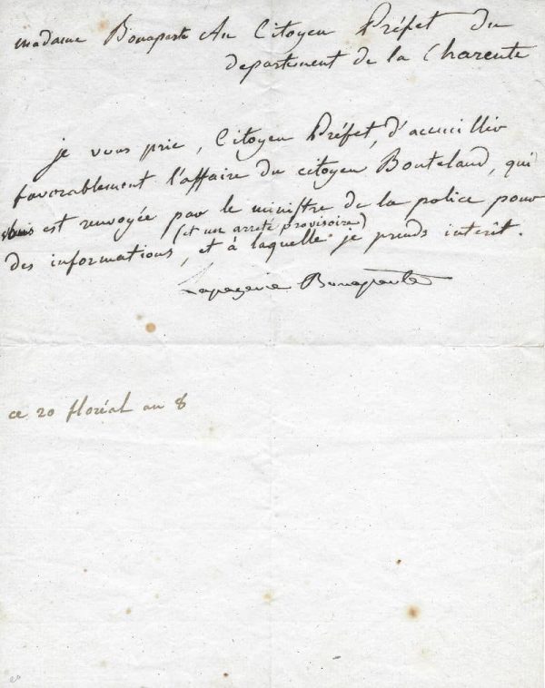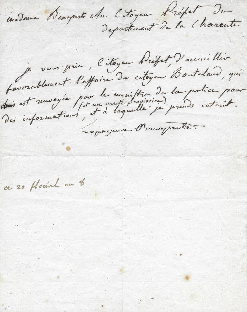 Joséphine joue de son influence en tant qu’épouse du 1er Consul Bonaparte : « Madame Bonaparte au citoyen préfet du département de la Charente. Je vous prie, citoyen préfet, d’accueillir favorablement l’affaire du citoyen Bouteland, qui est renvoyé par le ministre de la police pour des informations, et à laquelle je prends intérêt. »