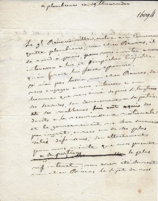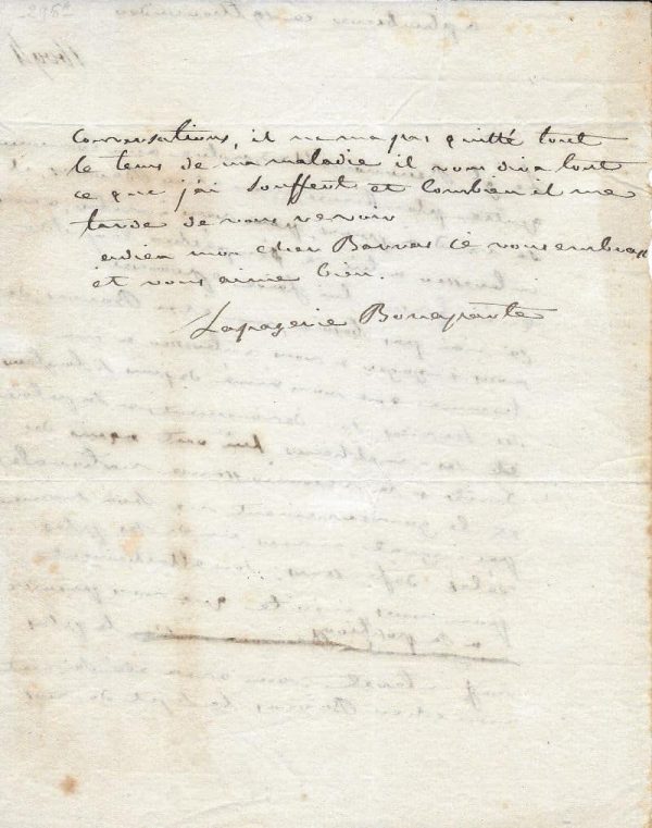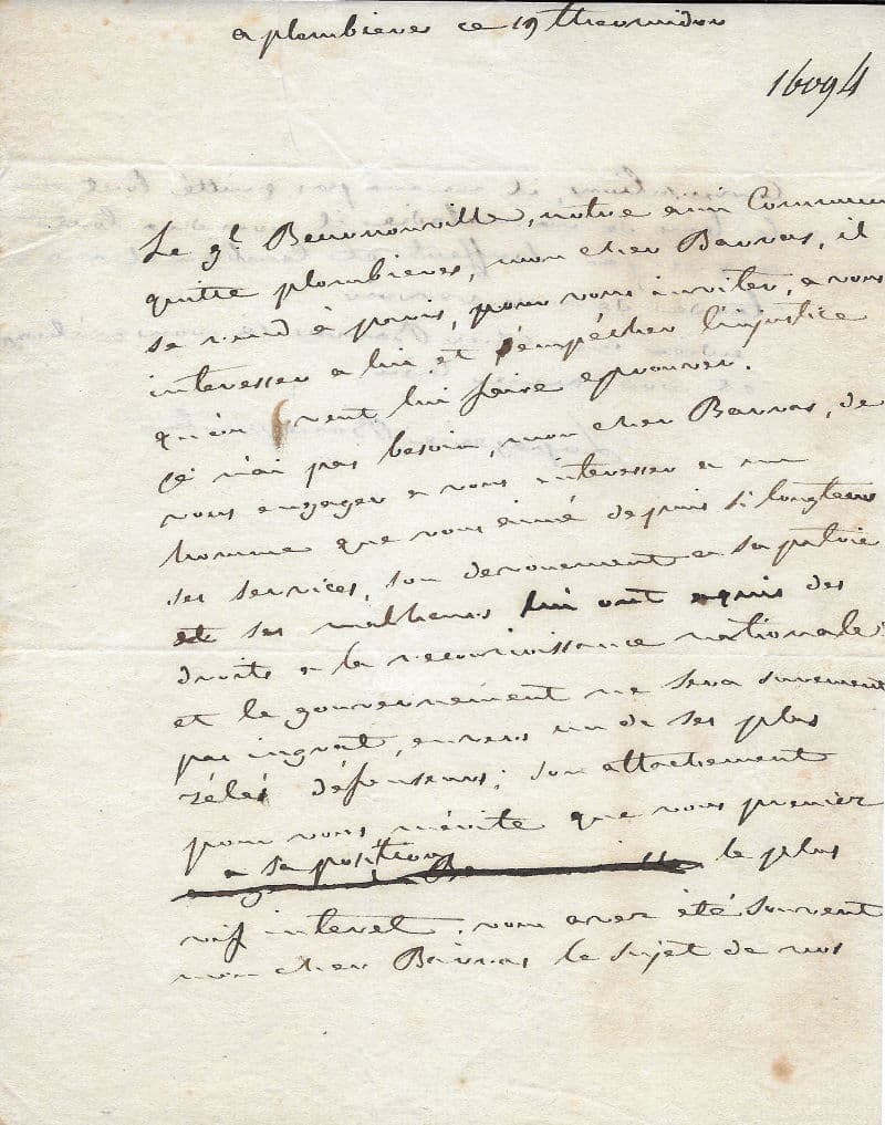 Belle lettre de Joséphine qui loue la loyauté du général Pierre Riel de Beurnonville, victime d’une injustice, à Paul de Barras. Il pourrait s’agir de ses accointances à la cause royaliste lorsqu’en 1797 il bénéficie du soutien du comte de Vaublanc pour siéger au Directoire : « Le g[énéra]l Beurnonville, notre ami commun quitte Plombières, mon cher Barras, il se rend à Paris, pour vous inviter, à vous intéresser à lui et s’empêcher l’injustice qu’on veut lui faire éprouver. Ce n’ai pas besoin, mon cher Barras, de vous engager & vous intéresser à un homme que vous aimé depuis si longtemps ses services, son dévouement à sa patrie et ses malheurs lui ont acquis des droits à la reconnaissance nationale et le gouvernement ne sera surement pas ingrat, enverra un de ses plus zélés défenseurs. Son attachement pour vous mérite que vous preniez a sa position [ligne biffée] le plus vif intérêt, vous avez été souvent mon cher Barras, le sujet de nos conversations, il ne m’a pas quitté tout le tems de ma maladie il vous dira tout ce que j’ai souffert et combien il me tarde de vous revoir. Adieu mon cher Barras je vous embrasse et vous aime bien… »