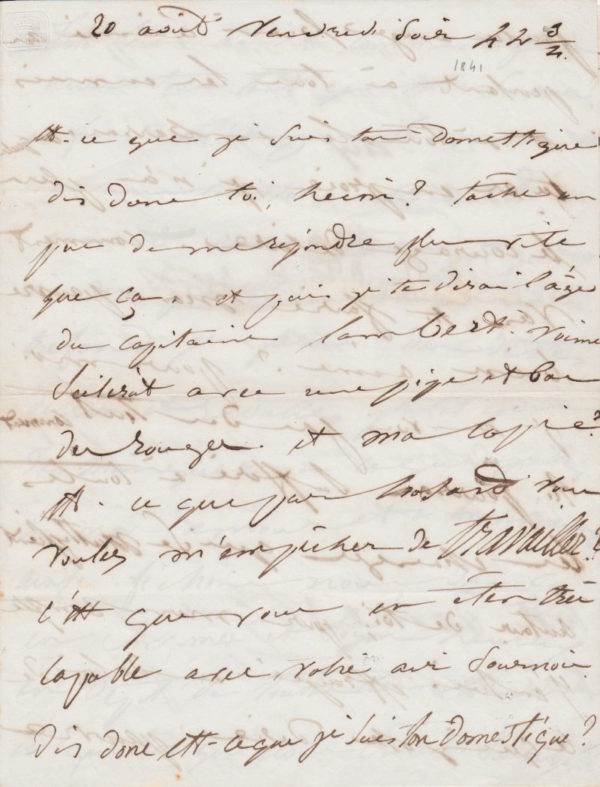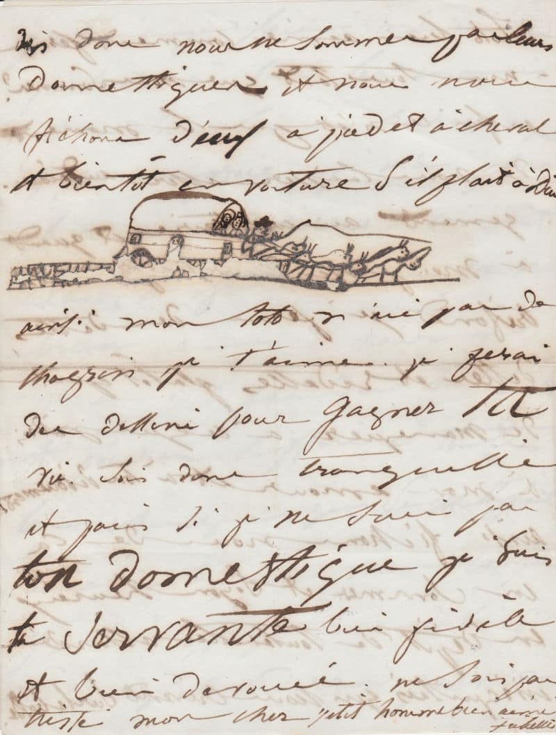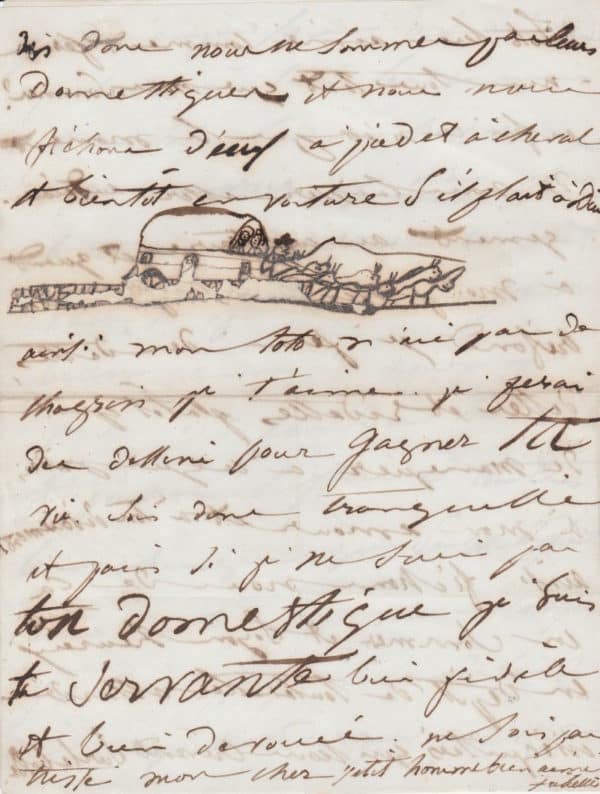 Jolie lettre emprunte d’humour, d’amour et de courage alors que Victor Hugo vient de faire son entrée à l’Académie Française le 3 juin 1841 : « Est-ce que je suis ton domestique dis-donc toi, heim ? Tâche un peu de me répondre plus vite que ça. Et puis je te dirai l’âge du capitaine Lambert. Voim, scélérat avec une pipe et bas des rouges. Et ma copie ? Est-ce que par hasard vous voulez m’empêcher de TRAVAILLER ? C’est que vous en êtes très capable avec votre air sournois. Dis-donc, est-ce que je suis ton domestique ? Pauvre ange bien aimé en pensant à tous les ennuis et à tous les embarras auxquels tu es en proie je n’ai plus le courage de rire. Comment vas-tu faire mon pauvre bien aimé ? Pour moi je ne vois pas du tout comment tu pourras suffire à toutes les charges qui se multiplient autour de toi ; pour mon compte j’en suis effrayée au-delà de ce que j’ose dire. Pauvre Toto bien aimé comment ferons-nous tant que nous sommes ? Enfin, ce n’est pas le moment de se laisser aller au découragement au contraire. Et quand à moi (…) je ferai des dettes, dettes et redettes plutôt que de manquer à ce que je dois à mon amour et à ton dévouement. Ainsi fichons-nous de ça en somme et soyons heureux en dépit de toutes les absurdes iniquités qui nous crèvent sur la bosse. Dis donc nous ne sommes pas leurs domestiques et nous nous fichons d’eux à pied et à cheval et bientôt en voiture s’il plait à Dieu. [dessin représentant une diligence tirée par six chevaux avec à l’intérieur Victor Hugo et Juliette Drouet]. Ainsi mon Toto n’aie pas de chagrin. Je t’aime. Je ferai des dessins pour gagner TA vie. Sois donc tranquille et puis si je ne suis pas TON DOMESTIQUE je suis ta SERVANTE bien fidèle et bien dévouée. Ne sois pas triste mon cher petit homme bien aimé. Juliette »