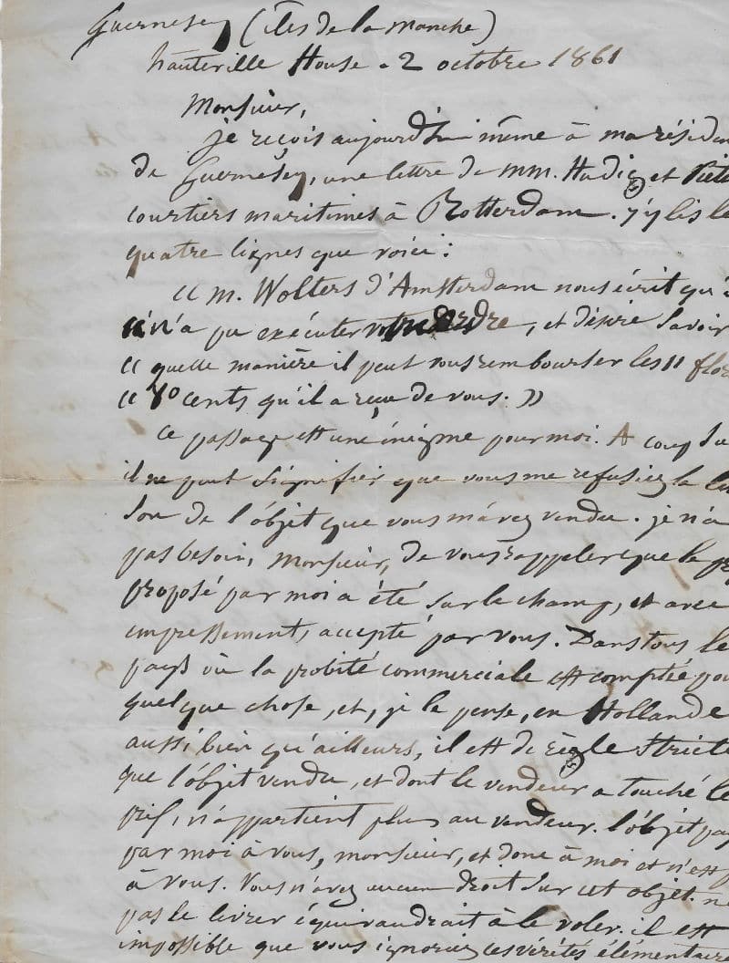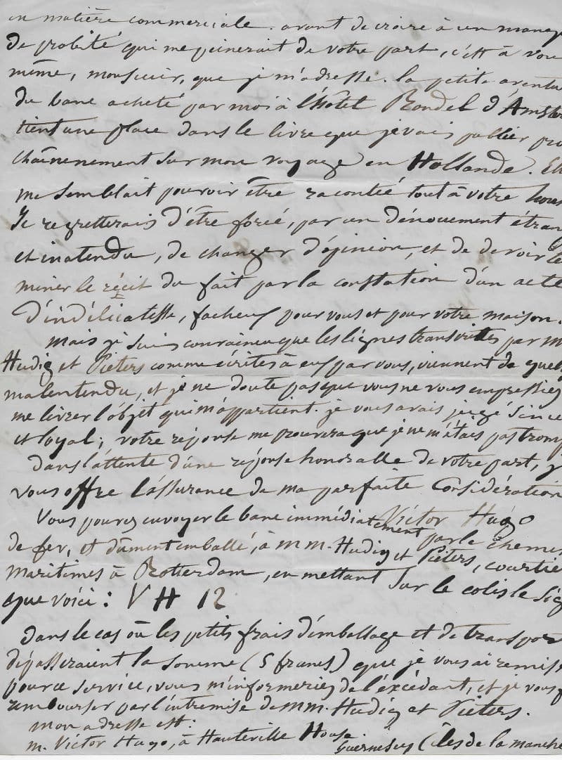 Hugo a reçu une lettre des courtiers maritimes de Rotterdam Hudig et Pieters, l’informant que Wolters refuse de livrer le banc. Il proteste de manière véhémente, entendant que si la livraison ne se faisait pas, il devrait modifier son récit en conséquence dû à « l’indélicatesse » de Wolters, ce qui serait fâcheux pour sa réputation : « Je reçois aujourd’hui même à ma résidence de Guernesey une lettre de MM. Hudig et Pieters, courtiers maritimes à Retterdam. J’y lis les quatre lignes que voici : « M. Wolters d’Amsterdam nous écrit qu’il n’a pu exécuter notre ordre, et désire savoir de « qu’elle manière il peut nous rembourser les 11 florins 80 cents qu’il a reçu de vous ». Ce passage est une énigme pour moi. A coup sûr, il ne peut signifier que vous me refusiez la livraison de l’objet que vous m’aviez vendu. Je n’ai pas besoin, Monsieur, de vous rappeler que le prix proposé par moi a été sur le champ, et avec empressement, accepté par vous. Dans tous les pays où la probité commerciale est comptée pour quelque chose, et, je le pense, en Hollande aussi bien qu’ailleurs, il est de règle stricte que l’objet vendu, et dont le vendeur a touché le prix, n’appartient plus au vendeur. L’objet payé par moi à vous, monsieur, est donc à moi et n’est pas à vous. Vous n’avez aucun droit sur cet objet. Ne pas le livrer équivaudrait à le voler. Il est impossible que vous ignoreriez ces vérités élémentaires en matière commerciale avant de croire à un manque de probité qui me peinerait de votre part, c’est à vous-même, Monsieur, que je m’adresse. La petite aventure du banc acheté par moi à l’hôtel Rondel d’Amsterdam tient une place dans le livre que je vais publier prochainement sur mon voyage en Hollande. Elle me semblait pouvoir être racontée tout à votre honneur. Je regretterais d’être forcé, par un dénouement étrange et inattendu, de changer d’opinion et de devoir terminer le récit du fait par la constatation d’un acte d’indélicatesse, fâcheux pour vous et pour votre maison. Mais je suis convaincu que les lignes transcrites par MM. Hudig et Pieters comme écrites à eux par vous, viennent de quelque malentendu, et je ne doute pas que vous ne vous empressiez de me livrer l’objet qui m’appartient. Je vous avais jugé sincère et loyal, votre réponse me prouvera que je ne m’étais pas trompé. Dans l’attente d’une réponse honorable de votre part, je vous offre l’assurance de ma parfaite considération. Victor Hugo. Vous pouvez envoyer le banc immédiatement par le chemin de fer, et dument emballé, à MM. Hudig et Pieters, courtiers maritimes à Rotterdam, en mettant sur le colis le signe que voici : VH 12. Dans le cas où les petits frais d’emballage et de transport dépasseraient la somme (5 francs) que je vous ai remise pour ce service, vous m’informeriez de l’excédent, et je vous ferais rembourser par l’entremise de MM. Hudig et Pieters. Mon adresse est : M. Victor Hugo, à Hauteville House. Guernesey (îles de la Manche) »