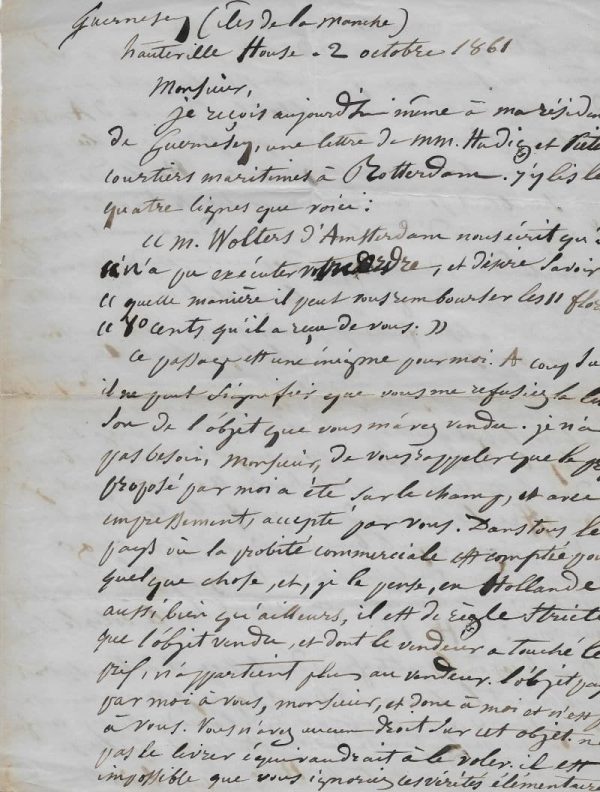 Copie autographe d’une lettre de Victor HUGO adressée à Monsieur Wolters à Amsterdam. Guernesey, Hauteville House, 2 octobre 1861 ; 2 pages in-4°.