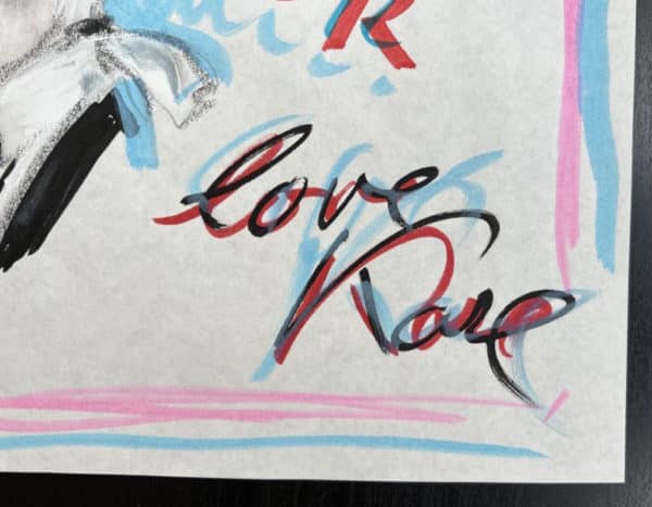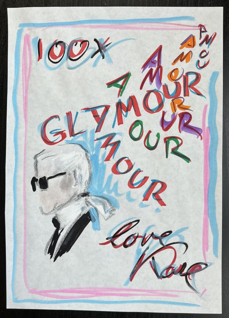 Superbe composition du maître de la Maison Chanel se représentant de profil, affublé de ses célèbres lunettes noires, entouré de guirlandes de lettres formant les mots Glamour et Amour, symboles de l’univers de la mode.