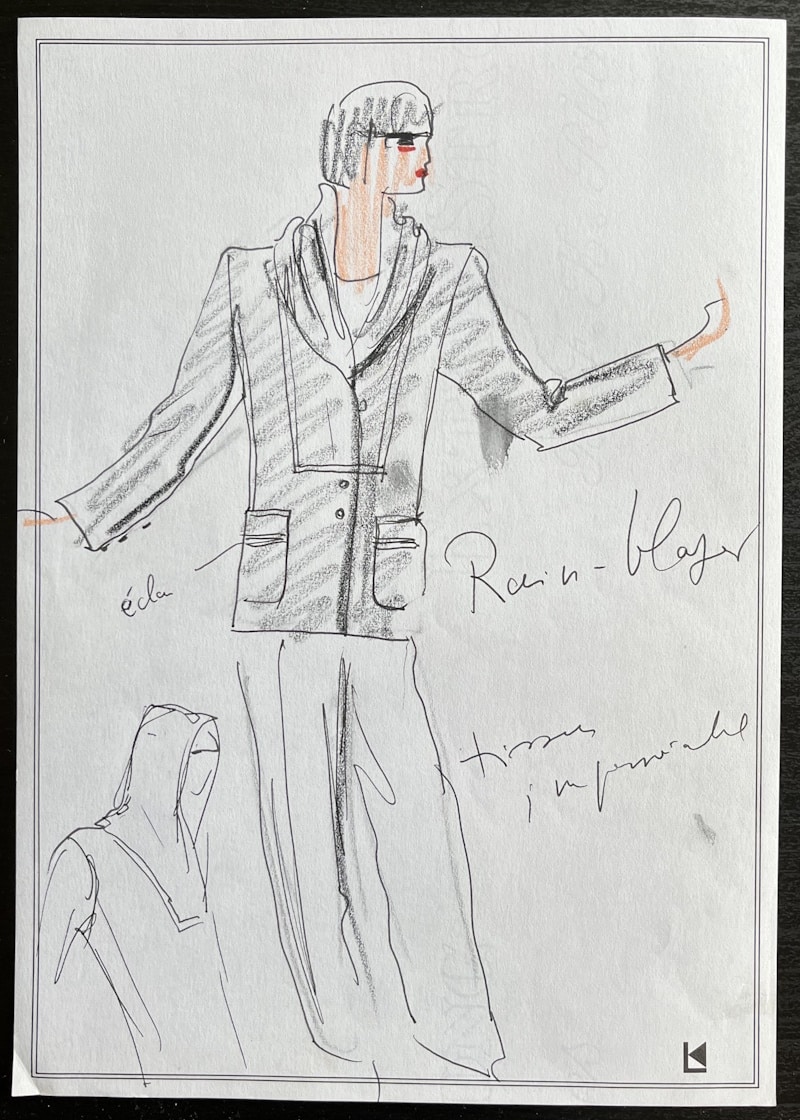 Dessin original réalisé au feutre noir, pastels de couleurs et mine de plomb sur papier personnel du couturier estampillé « KL » à l’angle inférieur droit, annotations de la main de Lagerfeld.