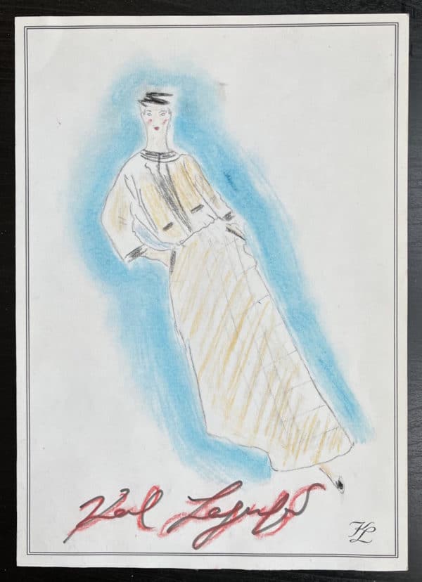 Dessin original réalisé aux feutre, pastel et crayons de couleur sur papier personnel du couturier estampillé « KL » à l’angle inférieur droit, signé en plein en marge inférieure.