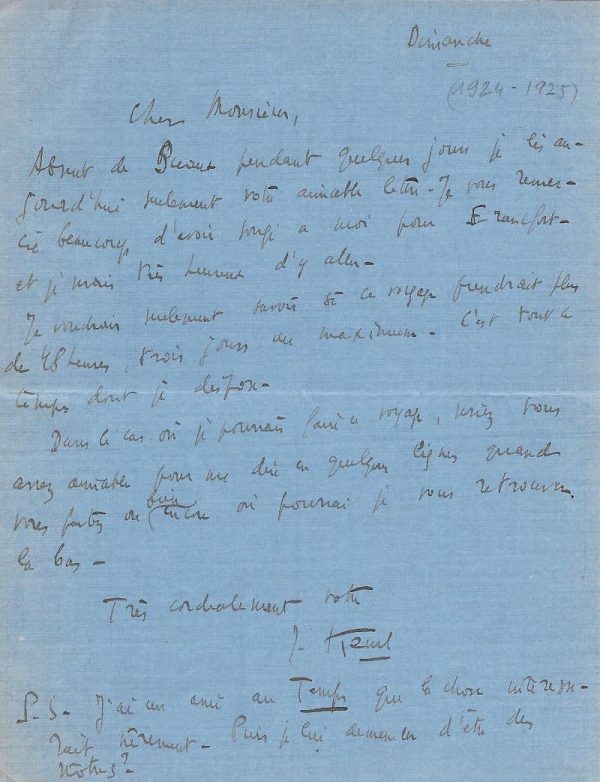 Lettre autographe signée au journaliste Benoist-Mechin. Dimanche (1924-1925) ; 1 page in-8°