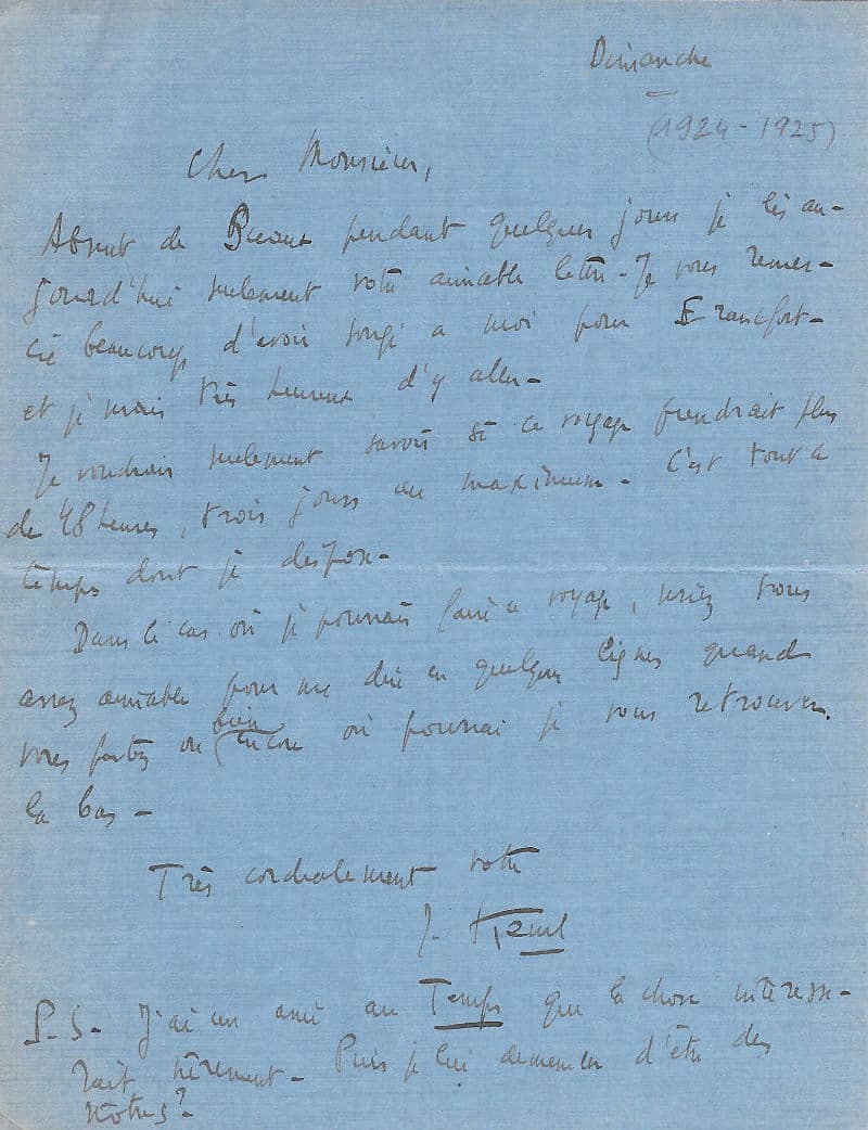 Invitation à Francfort : « (…) Je lis aujourd’hui seulement votre aimable lettre. Je vous remercie beaucoup d’avoir songé à moi pour Francfort et je serais très heureux d’y aller. Je voudrais seulement savoir si ce voyage prendrait plus de 48 heures, trois jours au maximum. C’est tout le temps dont je dispose. Dans le cas où je pourrais faire ce voyage seriez vous assez aimable pour me dire en quelques lignes quand vous faites du bien encore où pourrai je vous retrouver la bas (…) J’ai un ami au Temps que la chose intéresserait sûrement. Puis je lui demander d’être des nôtres ? »