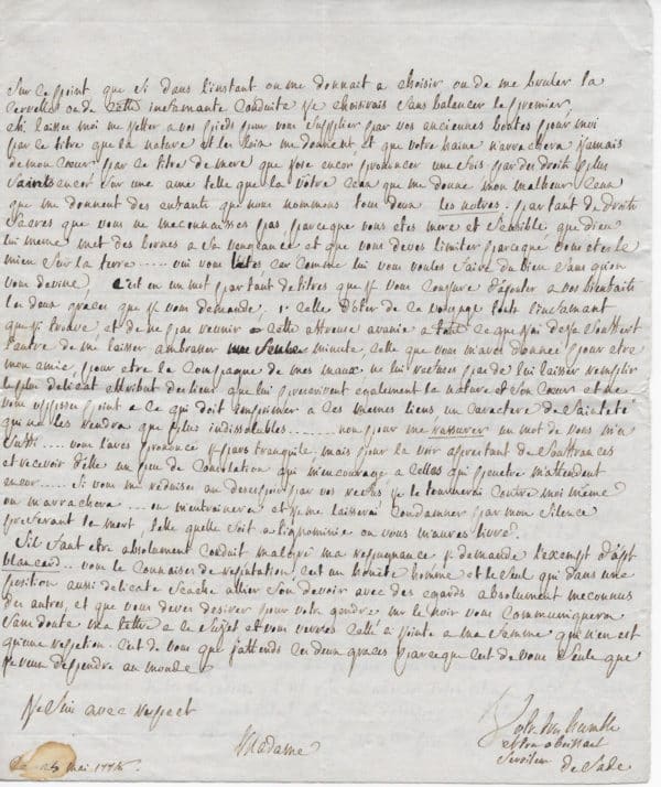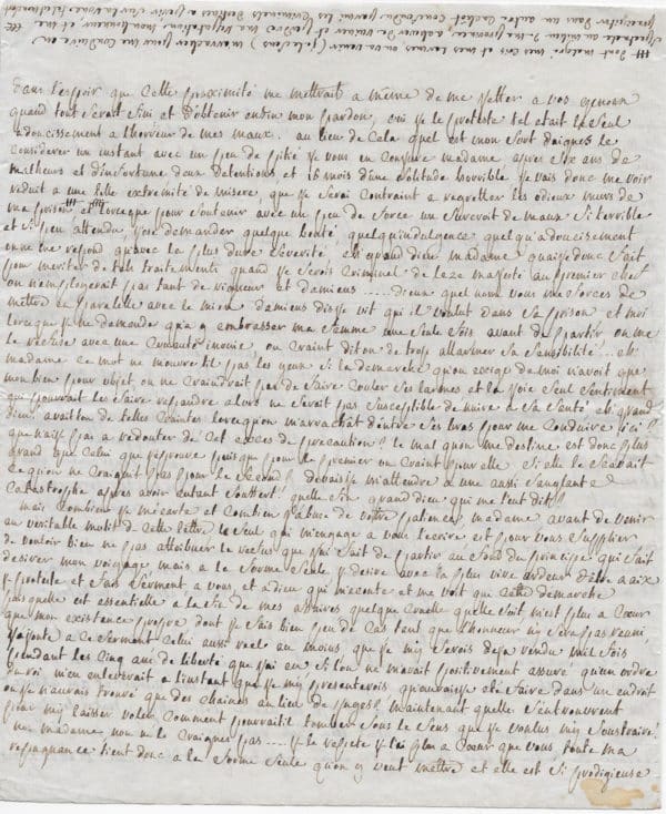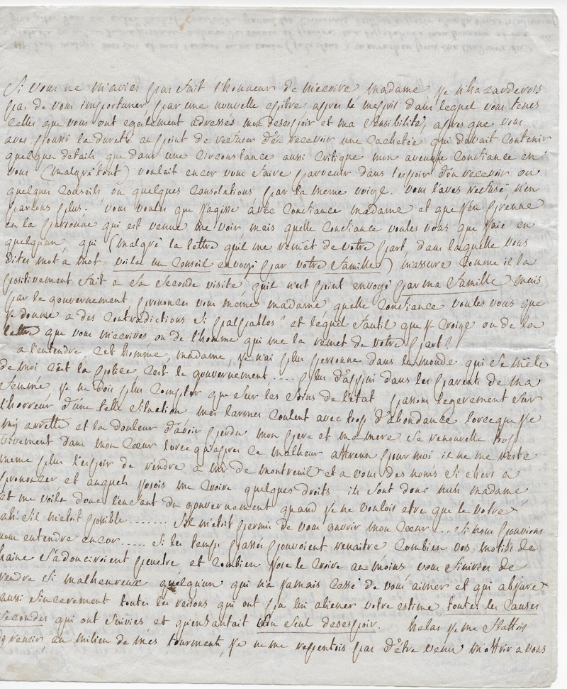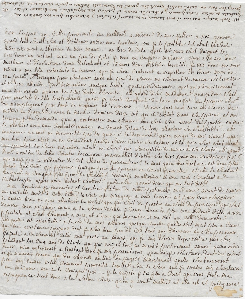 Belle lettre avant son transfert à Aix-en-Provence pour y être jugé, où se mêle rancœur contre sa belle-mère, Madame de Montreuil, mais aussi pitié et espoir de sortir dignement de ce procès infament : « Si vous ne m’aviez fait l’honneur de m’ecrire, Madame, je n’hazarderois pas de vous importuner par une nouvelle epitre, apres le mepris dans lequel vous tenez celles que vous ont également adressés mon desespoir et ma sensibilité, après que vous avez pousse la dureté au point de refuser une [lettre] cachetée qui devait contenir quelques details que dans une circonstance aussi critique mon aveugle confiance en vous (malgré tout) voulait encor vous faire parvenir dans l’espoir d’en recevoir en quelques conseils, en quelques consolations par la meme voix. Vous l’avez refusé, n’en parlons plus ; vous voulez que j’agisse avec confiance madame et que j’en prenne en la personne qui est venue me voir, mais quelle confiance voulez vous que j’aie en quelqu’un, qui (malgré la lettre qu’il me remet de votre part, dans laquelle vous dites mot a mot voila un conseil envoyé par votre famille [Bontoux]) m’assure comme il l’a positivement fait a sa seconde visite, qu’il n’est point envoyé par ma famille mais par le gouvernement prononcez vous-même madame, quelle confiance voulez vous que je donne a des contradictions si palpables ? Et lequel faut il que je croiye ou de la lettre que vous m’écrivez, ou de l’homme qui me la remet de votre part ? A l’entendre, cet homme, madame, je n’ai plus personne dans le monde qui se mêle de moi, c’est la police, c’est le gouvernement…Plus d’appui dans les parents de ma femme, je ne dois plus compter que sur les soins de l’état, passons legerement sur l’horreur d’une telle situation, Mes larmes coulent avec trop d’abondance lorceque je m’arrête et la douleur d’avoir perdu mon père et ma mère se renouvelle trop vivement dans mon cœur lorce qu’après ce malheur affreux pour moi il ne me reste meme plus l’espoir de rendre a M de Montreuil et a vous des noms si chers a prononcer et auquel seroit me croire quelques droits ils sont donc nuls Madame, et me voila donc l’enfant du gouvernement quand je ne voulois etre que le votre. Ah-s il m’était possible…..s’il m’était permis de vous ouvrir mon cœur…si nous pouvions nous entendre encor….si les temps passés pouvoient renaitre combien vos motifs de haine s’adouciroient peu etre et combien j’ose croire au moins, vous finiriez de rendre si malheureux quelqu’un qui n’a jamais cessé de vous aimer et qui abjure aussi sincerement toutes les raisons qui ont pu lui aliener votre estime toutes les causes secondes qui ont suivies et qu’enfantait son seul desepoir. Helas je me flattais d’y reusir, au milieu de mes tourments, je ne me repentois pas d’etre venu m’offrir a vous dans l’espoir que cette proximité me mettrait a même de me jetter a vos genoux quand tout serait fini, et d’obtenir enfin mon pardon, oui je le proteste tel était le seul adoucissement a l’horreur de mes maux. Au lieu de cela quel est mon sort daigner le considerer un instant avec un peu de pitié je vous en conjure Madame, après six ans de malheurs et d’infortune, deux detentions, et 16 mois d’une solitude horrible, je vais donc me voir reduit a une telle extremité de misere, que je serai contraint a regretter les odieux murs de ma prison [on va venir (je le sens) m’arracher pour me conduire en spectacle au milieu de ma province, achever de ruiner et perdre ma reputation, mon honneur et me precipiter dans un autre cachôt confondu parmi les criminels destinés a perir sur la roue tel est mon sort], et lorceque pour soutenir avec un peu de force un surcroit de maux si terrible et si peu attendu, j’ose demander quelque bonté, quelqu’indulgence, quelqu’adoucisement on ne me repond qu’avec la plus dure severite. Et grand dieu, Madame qu’ai-je donc fait pour meriter de tels traitements quand je serois criminel de leze majesté au premier chef on n’employerait pas tant de rigueur et damiens…..Dieux quel nom vous me forcer de mettre en paralelle avec le mien Damiens Dispe vit qu’il voulut dans sa prison, moi lorce que je ne demande qu’a y embrasser ma femme une seule fois, avant de partir, on me la refuse avec une cruauté inouie, on craint dit on de trop allarmer sa sensibilité…Eh ! Madame ce mot ne m’ouvre t il pas les yeux si la demarche qu’on exige de moi n’avoit que mon bien pour objet on ne craindrait pas de faire couler ses larmes et la joie seul sentiment qui pourrait les faire répandre alors ne savait pas susceptible de nuire a sa santé, eh ! grand dieu ! Avait on de telles craintes lorce qu’on m’arrachât d’entre ses bras pour me conduire ici ? Que n’ai-je pas a redouter de cet exces de precaution ? Le mal qu’on me destine est donc plus grand que celui que j’éprouve puis que pour le premier on craint pour elle, si elle le savait ce qu’on ne craignit pas pour le second ? Devais je m’attendre a une aussi sanglante catastrophe après avoir autant souffert ! Quelle fin grand dieu qui me l’eut dit ? Mais combien je m’écarte et combien j’abuse de votre patience, Madame, avant de venir au veritable motif de cette lettre, le seul qui m’engage a vous l’ecrire est pour vous supplier de vouloir bien ne pas attribuer le refus que j’ai fait de partir, au fond du principe qui fait desirer mon voyage mais a la forme seule, je desire avec la plus vive ardeur d’être a Aix. Je proteste et fais serment, a vous, et a dieu qui m’écoute et me voit que cette démarche puis qu’elle est essentielle a la fin de mes affaires, quelque cruelle qu’elle soit, m’est plus a cœur que mon existence propre dont je fais bien peu de cas tant que l’honneur n’y sera pas reuni. J’ajoute a ce serment, celui aussi reel au moins, que je m’y serois déjà rendu mil fois pendant les cin