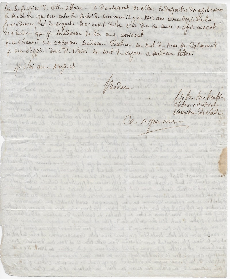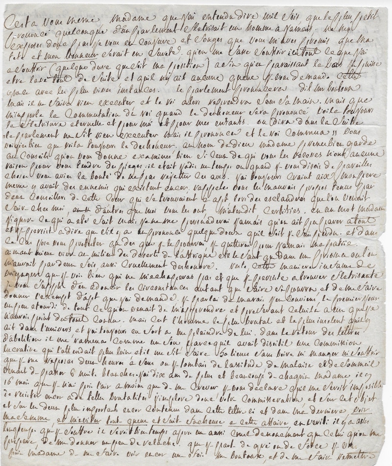 Belle lettre avant son transfert à la prison royale d’Aix-en-Provence. Le marquis de Sade éprouvé, s’en remet entièrement à sa belle-mère qui est à la manœuvre, pour le bon déroulé de son procès et que son honneur soit sauf : « C est a vous-même, Madame, que j’ai entendu dire mil fois, que le plus petit prononcé quelconque d’un parlement fletrisoit un homme a jamais ; ne m’y exposez donc pas je vous en conjure et songez que vous m’avez promis que ma tete et mon honneur serait en sureté ; qu’on me fasse souffrir ici tout ce que j’ai a souffrir (quelque dure que soit ma position) afin qu’en paraissant là bas je puisse etre lavé tout de suite, et qu’il n’y ait aucune queue, je vous demande. Cette grace avec les plus brèves instances. Le parlement prononcera dit un bonhomme mais il ne faira rien exécuter, et le roi alors reprendra dans sa main. Mais que m’importe la commutation du roi quand le deshoneur sera prononcé. Voilà toujours la flétrisure éternelle et pour moi et pour mes enfants. On dira dans la suite « le parlement ne dit rien executer mais il prononça et le roi commua ». Vous voyez bien que voilà toujours le deshoneur au nom de dieu madame prenez bien garde aux conseils qu’on vous donne examinez bien si ceux de qui vous les recevez n’ont aucune raison pour vous tendre des pièges, il était jadis un temps ou quand je vous disais de pareilles choses vous aviez la bonté de ne pas rejetter les avis. J’ai toujours craint Aix mon père même avait des ennemis qui existent encor, rappeler vous les mauvais propos tenus par deux conseillers de cette cour qui se trouvaient à Apt lors des esclandres que l’on venait faire chez moi, d’autres que moi vous les ont m’a-t-on dit certifiés. En un mot Madame j’ignore ce qui a été fait mais je ne me pardonnerai jamais qu’on ait pas parer a tout et je perçois a dire que s’il y a à prononcé quelque doux qu’il soit je suis perdu. Et dans ce cas j’ose vous protester que dès que je le pourrai, je quitterai pour jamais ma patrie aimant mieux vivre au milieu du desert de l’Afrique s’il le faut que dans une province ou l’on m’aurait par deux fois aussi cruellement deshonoré. Reste, cette manière infame de voyager que je vois bien qui ne m’échapera pas et que je perçois a trouver fletrisante. Je vous supplie d’en adoucir les circonstances autant que faire se pourra et de me faire donner l’exempt d’Apt que j’ai demandé. Je parlai de Marais [l’inspecteur Marais qui sera chargé de le conduire du donjon de Vincennes à la prison royale d’Aix] j’en conviens, le premier jour un peu etourdi de tout ce qu’on venait de m’apprendre et preferant celui la a un que je n’aurais point du tout connu. Mais c’est l’homme le plus brutal et le plus insolent qu’il y ait dans l’univers, et j’ai toujours eu fort a me plaindre de lui. Dans le retour des lettres d’abolition il me ramena comme un fou, parce qu’il avait disait il une commission qui l’attendait plus loin, et il me fit faire 50 lieues sans boire ni manger ni souffrir que je me reposa deux heures à Sens ou je tombais de lassitude de malaise et de sommeil venant de passer 6 nuits blanches. J’ai dix ans de plus et beaucoup de chagrin Madame, il y 16 mois que je n’ai pas pris l’air a moins que de me crever. Je vous declare qu’il me serait impossible de resister encor a de telles brutalites . J’implore donc votre commisseration, et sur cette vie et sur les deux plus importants encor contenu dans cette lettre ci et dans ma derniere, voit ma femme, et m’eviter toute queue et suite facheuse a cette affaire, en vérité il y a assez longtemps que je souffre il serait bien temps apres un aussi cruel denouement que celui qu’on me prepare, de me donner un peu de relache. Que je pars de gré ou de force je compris, Madame, de me faire voir encore une fois M Bontoux et de me faire remettre tous les papiers de cette affaire. Le désistement des filles, la deposition des apoticaires, le mémoire que vous eutes la bonte de m’envoyer il y a trois ans avec copie de la procedure, et la requete &c. Ensuite de me faire dire au moins a quel avocat il faudra que je m’adresse la bas en y arrivant. Je ne saurais vous exprimer Madame combien un mot de vous me calmerait. Je vous supplie donc de faire un mot de reponse a mes deux lettres (…) »