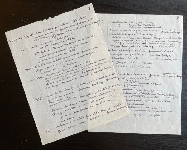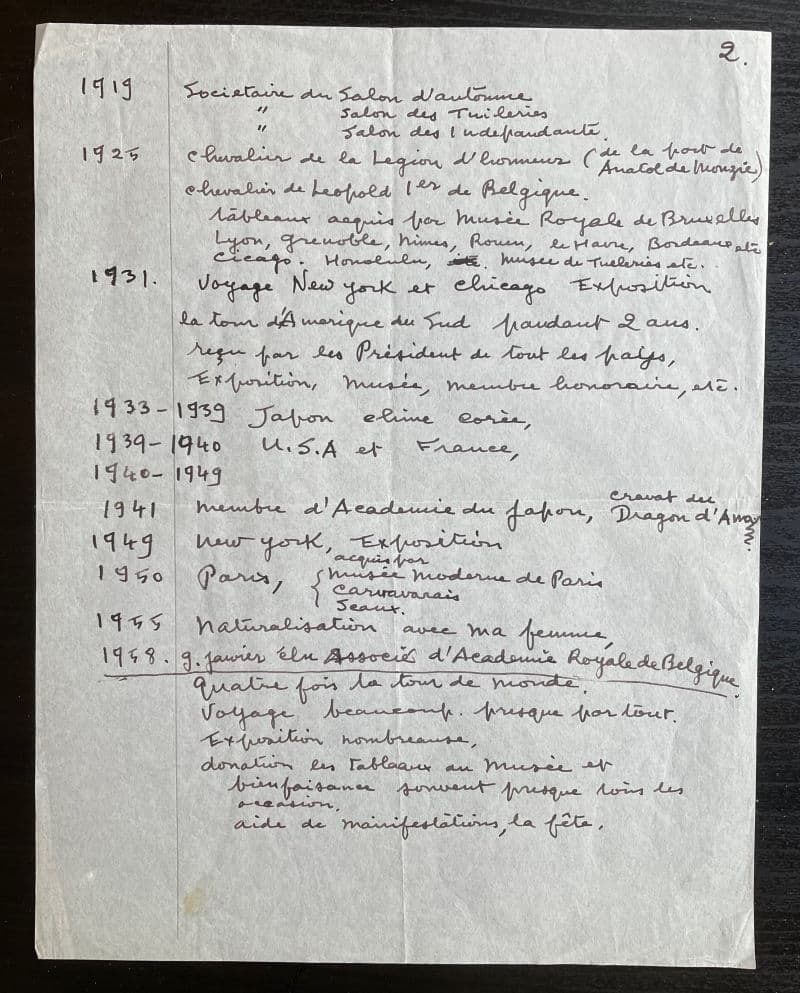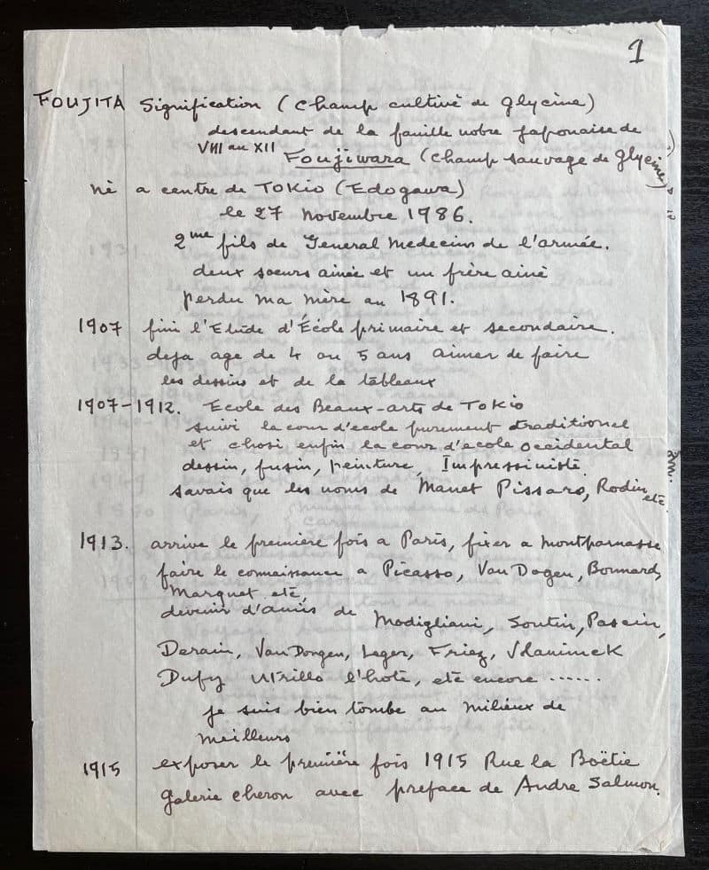 Précieux et émouvant curriculum vitae rédigé par Foujita pour son dossier de remise de médaille d’Officier de la Légion d’Honneur, par son ami Léon Julliot de la Morandière en 1958, trois ans après avoir été naturalisé français, et trente-trois ans après avoir été promu officier de la Légion d’Honneur. Cette promotion couronne une exceptionnelle carrière nationale et internationale, qui a débuté dans les années folles au quartier de Montparnasse, en compagnie de Picasso, Modigliani, Kiki et bien d’autres, jusqu’à son retour triomphal en France après la seconde guerre mondiale.