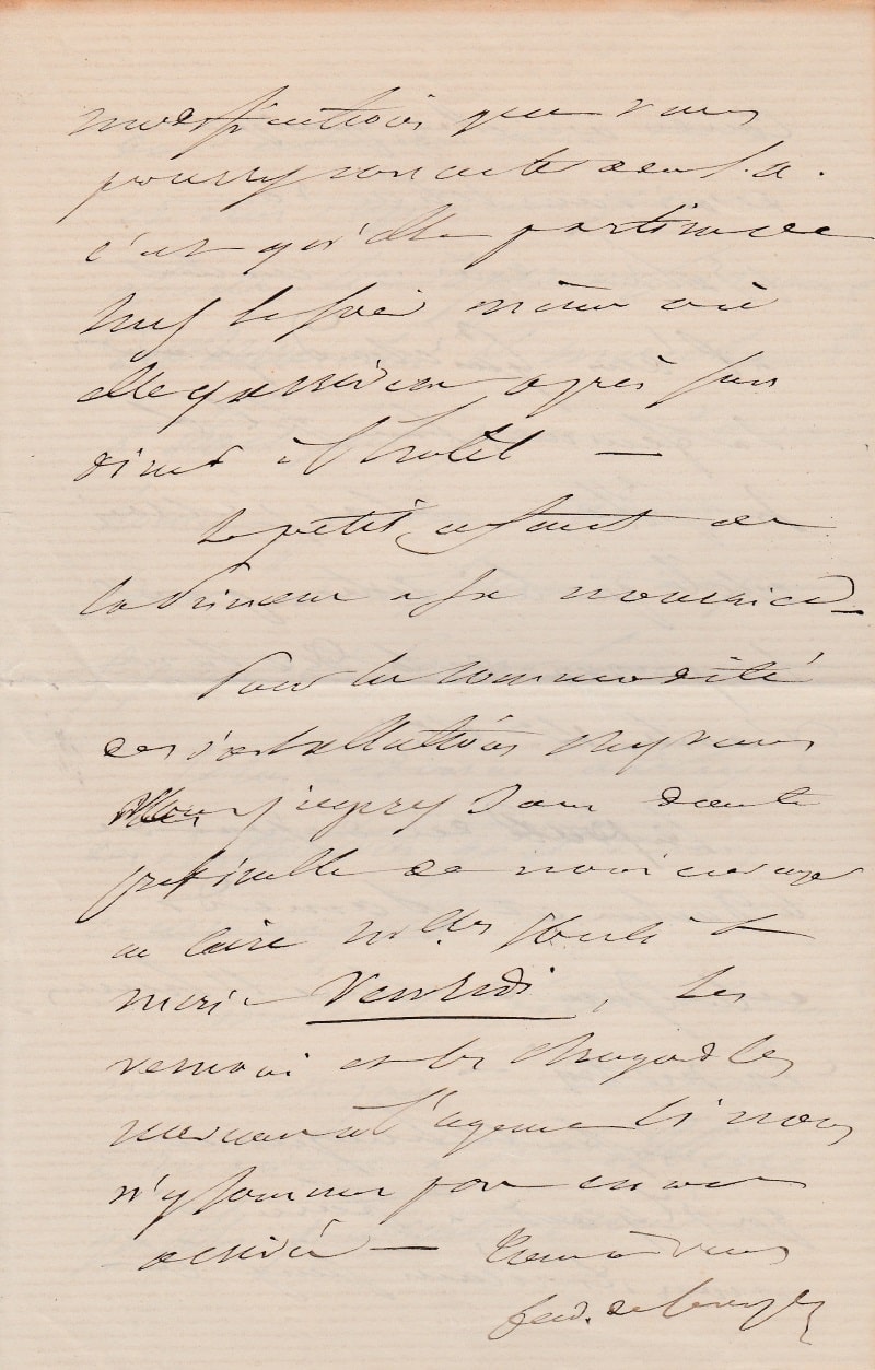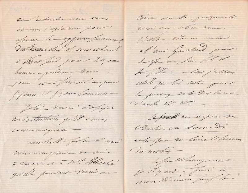 Ferdinand de Lesseps organise l’inauguration du Canal de Suez : « Ma lettre du Caire vous donne les instructions pour le voyage de S.A.R. la Princesse Amédée de Savoie Duchesse d’Aoste (première femme du duc d’Aoste à la santé fragile, la princesse est envoyée avec son jeune époux à l’inauguration du canal de Suez, elle doit rapidement revenir en Italie suite à une crise de tuberculose aggravée par l’explosion des machines du bateau). C’est une charmante et gracieuse personne. Vernoni a été chargé par moi de l’accompagner et en même temps il a la mission enviable de s’entendre avec vous et vos ingénieurs pour aviser les approvisionnements des marchés et marchands à Port Saïd pour 20 000 hommes pendant deux jours et à Ismaïlia pour 5 jours et 50 000 hommes. Je lui ai donné à ce propos des instructions qu’il vous communiquera. Ma belle-fille et moi nous vous prions de dire à Marie et Mlle Oberlé qu’elles peuvent venir au Caire 11 heures du matin (…) Le petit enfant de la princesse a sa nourrice (…) »