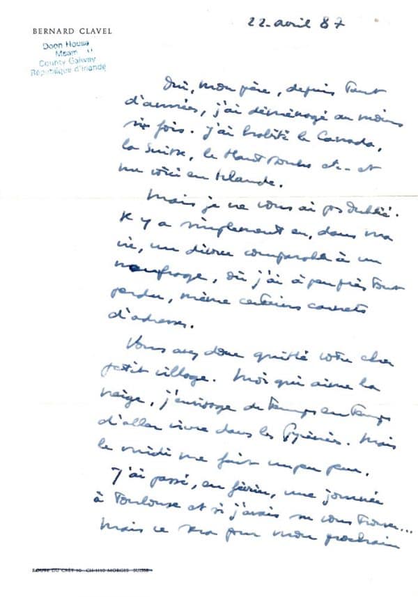 Belle lettre de Clavel à l’abbé Casy-Rivière : « … Oui, mon père, depuis tant d’années, j’ai déménagé au moins six fois. J’ai habité le Canada, la Suisse, le Haut Doubs etc… et me voici en Irlande. Mais je ne vous ai pas oublié. Il y a simplement eu, dans ma vie, un divorce comparable à un naufrage, où j’ai à peu près tout perdu, même certains carnets d’adresses. Vous avez donc quitté votre cher village. Moi qui aime la neige, j’envisage de temps en temps d’aller vivre dans les Pyrénées. Mais le midi me fait un peu peur. J’ai passé, en février, une journée à Toulouse et si j’avais su vous trouver… Mais ce sera pour mon prochain voyage dans la région. Pour l’heure, je plonge dans un très gros roman qui me terrifie. J’ai toujours écrit dans la peur, et je ne parviens pas à en prendre l’habitude… »