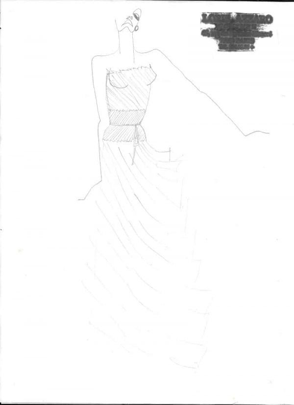 Croquis de deux robes au crayon graphite au recto et verso d’une feuille tamponnée au nom et à l’adresse du couturier. Indications manuscrites sur un des deux croquis : « Tulle brodé rouge de Sofia » et « Taffetas rouge »