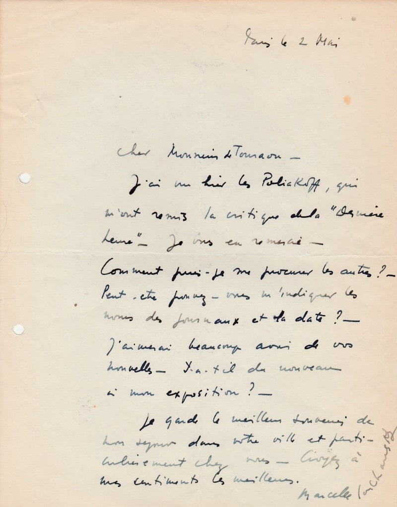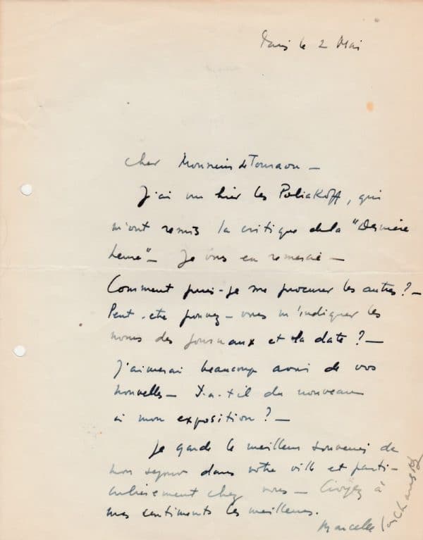 3-Lettre autographe signée au galeriste belge Eraste Touraou. Paris 2 mai ; 1 page in-4°. Deux trous de perforation