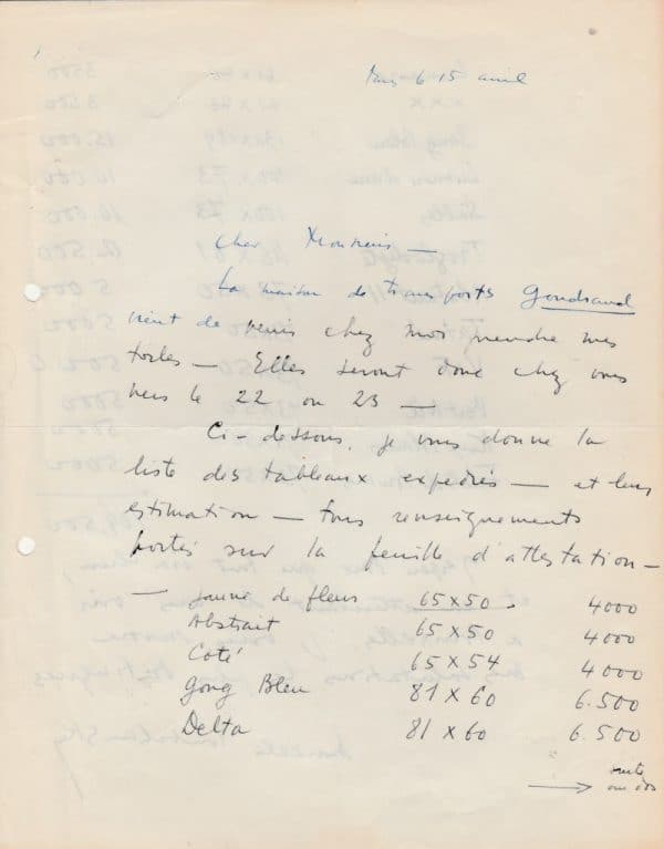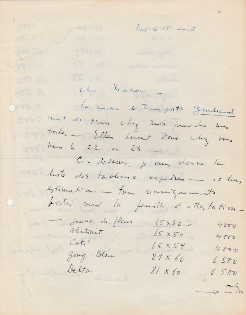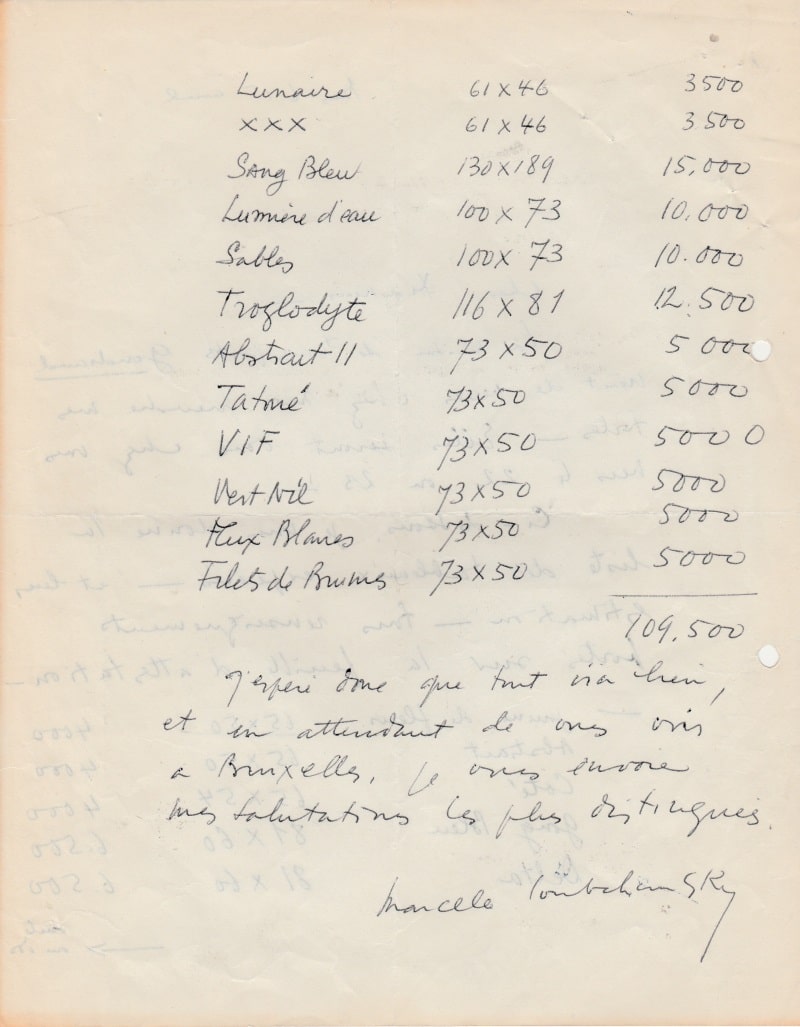 Loubchansky expédie ses tableaux chez son galeriste belge : « La maison de transport Gondiaud vient de venir chez moi prendre mes toiles – Elles seront donc chez vous vers le 22 ou 23 – Ci-dessous, je vous donne la liste des tableaux expédiés – et leur estimation – tous renseignements portés sur la feuille d’estimation – (liste de tableaux avec dimensions et prix). J’espère donc que tout ira bien, et en attendant de vous voir à Bruxelles… »