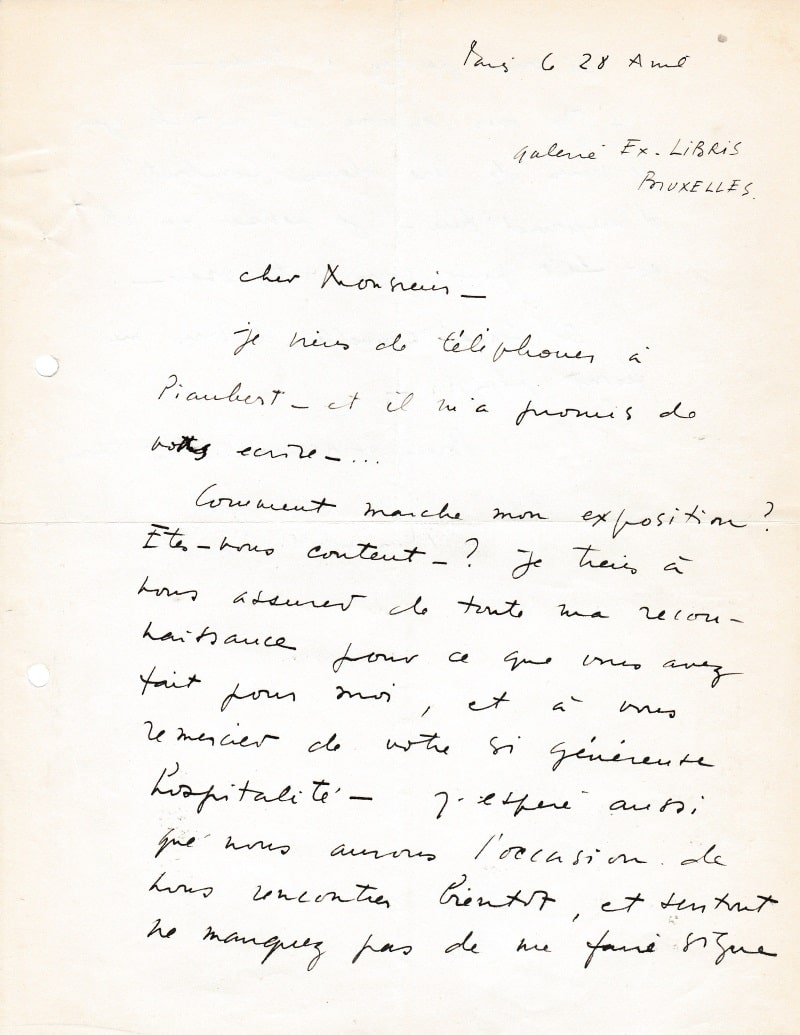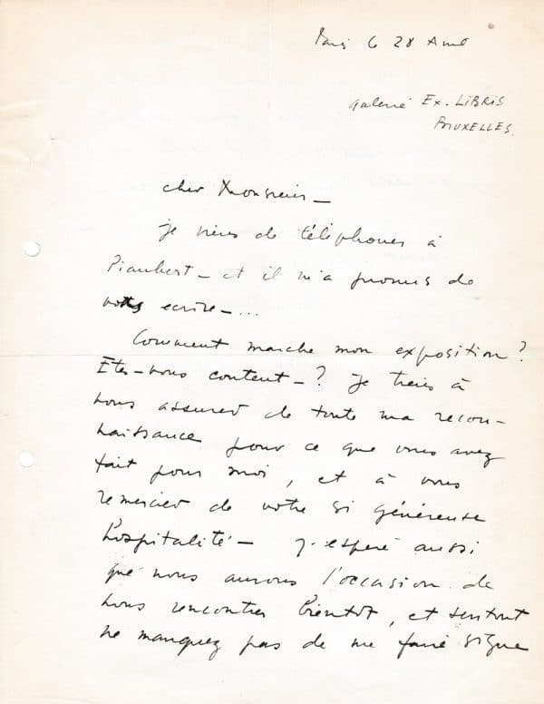 2-Lettre autographe signée au galeriste belge Eraste Touraou. Paris 28 avril ; 1 page ½ in-4°. Deux trous de perforation