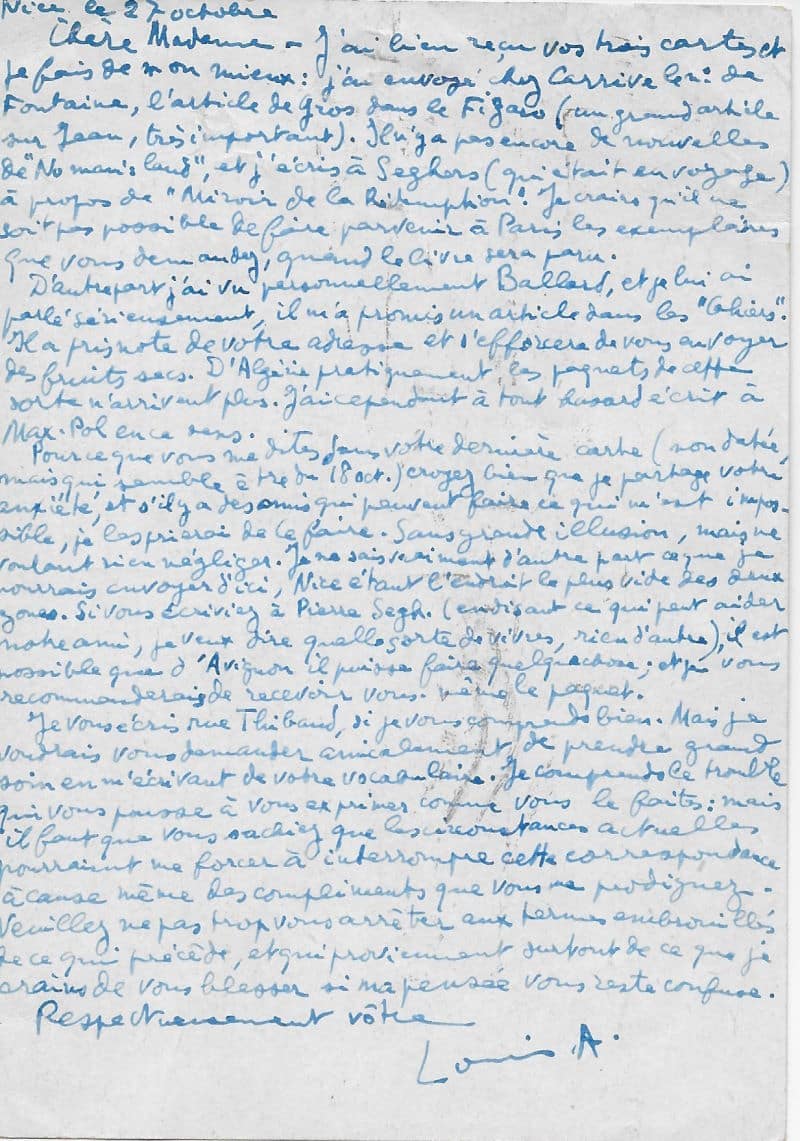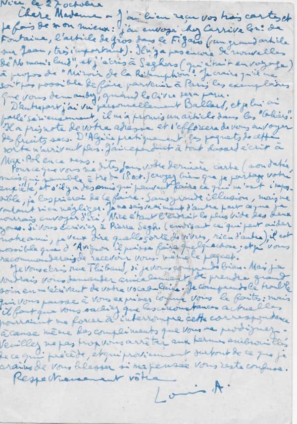 L’écrivain et résistant Jean Cayrol est arrêté sur dénonciation en 1942 et déporté au camp de concentration de de Mauthausen-Gusen. Aragon se démène, dans la mesure de ses moyens limités, par ces temps difficiles, pour publier les écrits de son ami, mais il prévient en substance Monique Chambaud, de faire très attention à ce qu’elle écrit dans ses courriers. Rare et remarquable carte de Louis Aragon qui ne cite jamais le nom de l’écrivain déporté pour ne pas risquer de se compromettre, il sait les dangers encourus, les courriers ne devant pas être dissimulés du service des contrôles : « Chère Madame – J’ai bien reçu vos trois cartes et je fais de mon mieux : j’ai envoyé chez Carrive le n° de Fontaine, l’article de Gros dans le Figaro (un grand article de « No man’s land », et j’écris à Seghers (qui était en voyage) à propos de « Miroir de la Rédemption ! Je crains qu’il ne soit pas possible de faire parvenir à Paris les exemplaires que vous demandez, quand le livre sera paru. D’autre part j’ai vu personnellement Ballard, et je lui ai parlé sérieusement, il m’a promis un article dans les « Cahiers ». Il a pris note de votre adresse et s’efforcera de vous envoyez des fruits secs. D’Algérie pratiquement les paquets de cette sorte n’arrivent plus. J’ai cependant à tout hasard écrit à Mac Pol en ce sens. Pour ce que vous me dites dans votre dernière carte (non datée, mas qui semble être du 18 oct.) croyez bien que je partage votre anxiété, et s’il y a des amis qui peuvent faire ce qui m’est impossible, je les prierai de le faire. Sans grande illusion, mais ne voulant rien négliger. Je ne sais vraiment d’autre part ce que je pourrais envoyer d’ici, Nice étant l’endroit le plus vide des deux zones [référence ici à la zone libre et occupée]. Si vous écriviez à Pierre Segh.[Pierre Seghhers] (en disant ce qui peut aider notre ami, je veux dire quelle sorte de vivres, rien d’autre), il est possible que d’Avignon il puisse faire quelque chose ; et je vous recommanderais de recevoir vous-même le paquet. Je vous écris rue Thibaud, si je vous comprends bien. Mais je voudrais vous demander amicalement de prendre grand soin en m’écrivant de votre vocabulaire. Je comprends le trouble qui vous pousse à vous exprimer comme vous le faites ; mais il faut que vous sachiez que les circonstances actuelles pourraient me forcer à interrompre cette correspondance à cause même des compliments que vous me prodiguez. Veuillez ne pas trop vous arrêter aux termes embrouillés de ce qui précède, et qui proviennent surtout de ce que je crains de vous blesser si ma pensée vous reste confuse… »