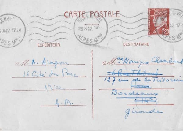 Carte autographe signée « Louis A. » à Monique Chambaud. 16 Cité du Parc, Nice, le 27 octobre (1942) ; 1 page in-12°. Adresses au verso de la carte : Mme Monique Chambaud, 127 rue de la trésorerie, Bordeaux. Cachets et timbre postales.