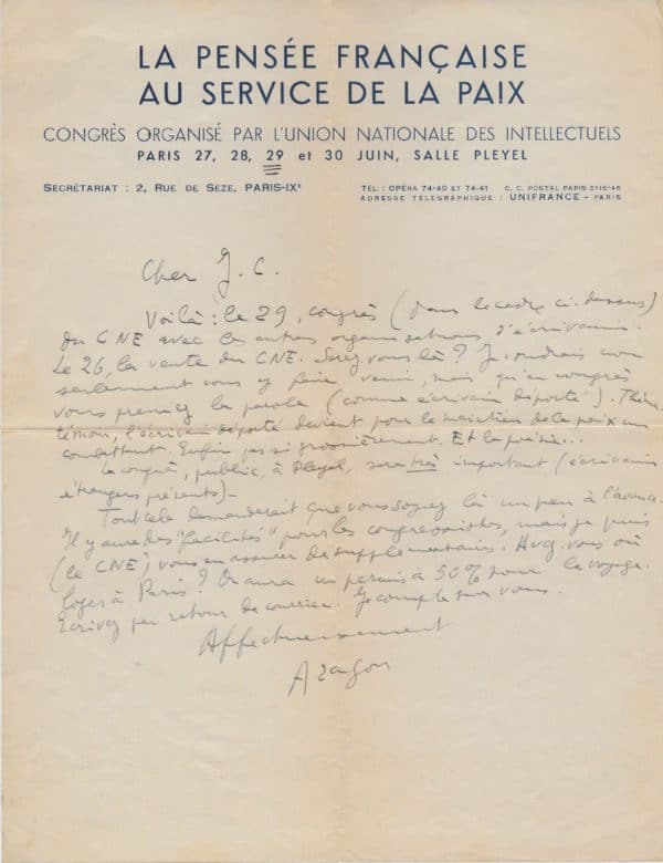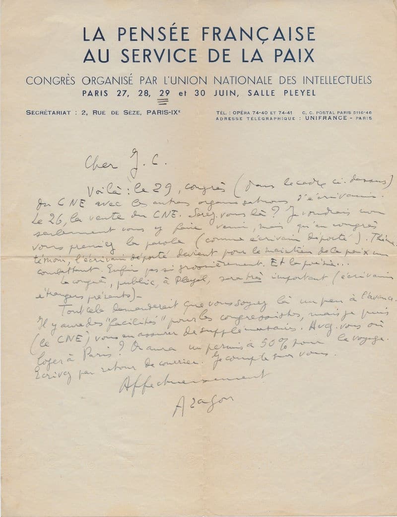 Dans le cadre de l’organisation du congrès international de « La pensée française au service de la paix », qui se déroulera salle Playel à Paris du 27 au 30 juin 1946, Aragon insiste pour que Jean Cayrol, écrivain et ancien déporté, y participe. Il a souligné la date du 29, à l’en-tête du courrier, indiquant par-là la date de sa prise de parole : « Cher J.C. Voilà : le 29, congrès ‘pour le cadre ci-dessous) du CNE avec les autres organisations d’écrivains. Le 26, la vente du CNE. Serez-vous là ? Je voudrais non seulement vous y faire venir, mais qu’au congrès vous preniez la parole (comme écrivain déporté). Thème : témoin, l’écrivain déporté devient pour le maintien de la paix un combattant. Enfin pas si grossièrement. Et la poésie… Le congrès, public, à Pleyel, sera très important (écrivains étrangers présents). Tout cela demanderait que vous soyez là un peu à l’avance. Il y aura des « facilités » pour les congressistes, mais je puis (le CNE) vous en assurer de supplémentaires. Avez-vous où loger à Paris ? On aura un permis à 50% pour le voyage. Ecrivez par retour de courrier. Je compte sur vous… »