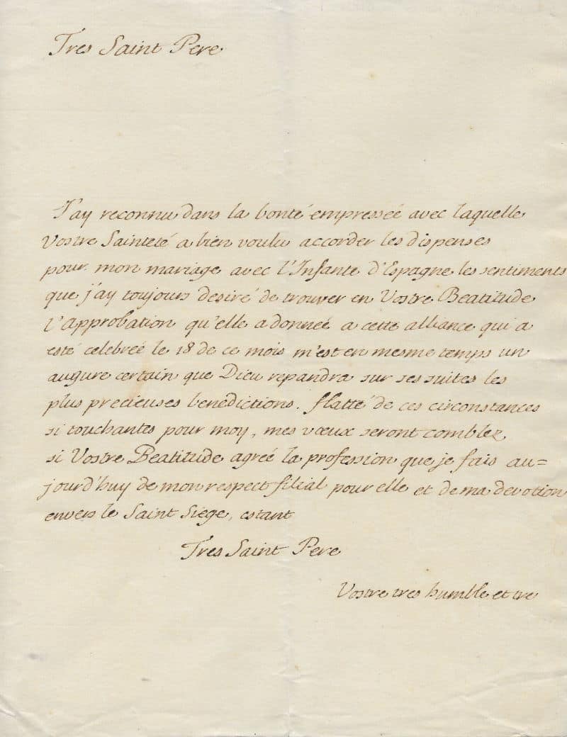 Ebauche de lettre de remerciement au pape, qui a accordé sa bénédiction au mariage du dauphin de France et de l’infante d’Espagne : « Tres Saint Pere, J’ay reconnu dans la bonté empressée avec laquelle vostre Sainteté a bien voulu accorder les dispenses pour mon mariage avec l’Infante d’Espagne les sentiments que j’ay toujours desiré de trouver en Vostre Beatitude l’approbation qu’elle a donnée a cette alliance qui a esté celebrée le 18 [le mariage a été célébré le 19 février 1745] de ce mois m’est en mesme temps un augure certain que Dieu repandra sur ses suites les plus precieuses benedictions flatte de ces ciconstances si touchantes pour moy, mes vœux seront comblez si Vostre Beatitude agrée la profession que je fais aujourd’huy de mon respect filial pour elle et de ma devotion envers le Saint Siege, estant Tres Saint Pere vostre tres humble et tres »