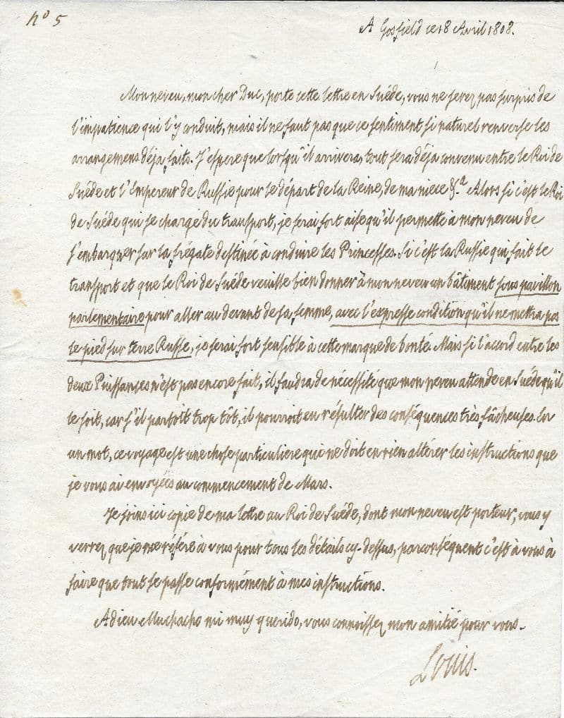 Louis XVIII arrange les conditions diplomatiques dans lesquelles doit se faire le départ de son neveu pour rejoindre sa femme : « Mon neveu, mon cher Duc, porte cette lettre en Suède, vous ne serez pas surpris de l’impatience qui l’y conduit, mais il ne faut pas que ce sentiment si naturel renverse les arrangemens déjà faits. J’espère que lorsqu’il arrivera, tout sera déjà convenu entre le Roi de Suède et l’Empereur de Russie pour le départ de la Reine, de ma nièce (…) Alors si c’est le Roi de Suède qui se charge du transport, je serai fort aise qu’il permette à mon neveu de s’embarquer par la frégate destinée à conduire les Princesses. Si c’est la Russie qui fait se transport et que le Roi de Suède venisse bien donner à mon neveu un bâtiment sous pavillon parlementaire pour aller au devant de sa femme, avec l’expresse condition qu’il ne mettra pas le pied sur terre Russe, je serai fort sensible à cette marque de bonté. Mais si l’accord entre les deux Puissances n’est pas encore fait, il faudra de nécessité que mon neveu attende en Suède qu’il le soit, car s’il partait trop tôt, il pourrait en résulter des conséquences très fâcheuses. En un mot, ce voyage est une chose particulière qui ne doit en rien altérer les instructions que je vous ai envoyées au commencement de Mars. Je joins ici copie de ma lettre au Roi de Suède, dont mon neveu est porteur, vous y verrez que je me réfère à vous pour tous les détails cy-dessus, par conséquent c’est à vous à faire que tout se passe conformément à mes instructions. Adieu Muchacho mi muy querido, vous connaissez mon amitié pour vous… »