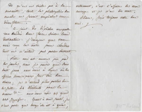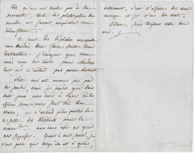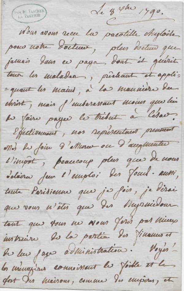 Belle lettre des débuts de la Révolution qui laisse entrevoir l’intérêt de Madame Roland pour les affaires politiques et son avis bien tranché, qui la feront passer à la postérité après son exécution le 8 novembre 1793 : « Nous avons reçu la pastille Angloise pour notre docteur, plus docteur que jamais dans ce pays dont il guérit tous les malades, prêchant et appliquant les mains, à la manière du Christ, mais s’embarrassant moins que lui se faire payer le tribut à César. Effectivement, nos représentants prennent assez de soin d’assurer ou d’augmenter l’impôt, beaucoup plus que de nous éclairer sur l’emploi des fonds. Aussi, toute Parisienne que je sois, je dirai que vous n’êtes que des myrmidons tant que vous ne vous ferés pas mieux instruire de la partie des finances et de leur sage administration. Voyés les ménagères connoissent le faible et le fort des maisons, comme des empires, et dès qu’on ne veille pas à la marmitte, toute la philosophie du monde ne sauroit empêcher une déconfiture. Ci-joint des dépêches auxquelles vous voudrés bien faire suivre leur destination. J’imagine que vous aurés reçu la nôtre pour Londres dont on n’entend pas parler souvent. Notre ami est encore pris par la jambe, mais je pense que sous huit jours nous irons à Lyon où les officiers municipaux sont très bien choisis ; je n’entends plus parler de la suite des élections pour le maire, etc..nous irons voir ce que cela signifie. Quant à ma santé, je n’en parle que lorsqu’elle est à quia, autrement, c’est l’affaire de mon courage et je n’en dis mot. Adieu, soyés toujours notre bon ami. »