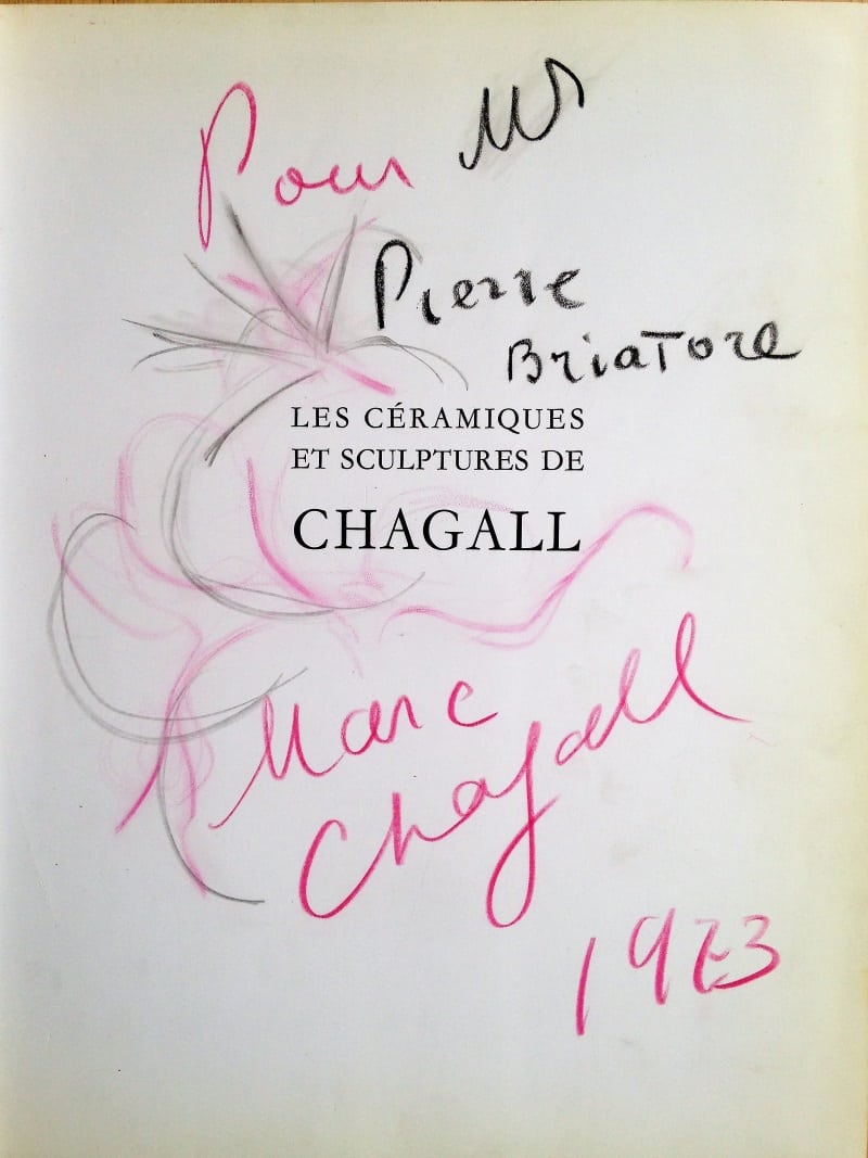 Dessin signé et daté de Marc Chagall sur la page de garde du livre « Les céramiques et sculptures de Chagall ».