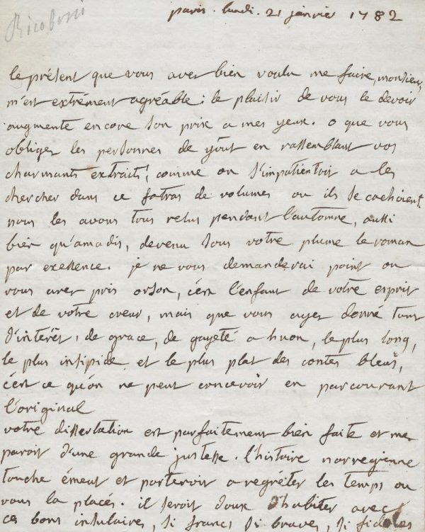 Belle lettre de Marie-Jeanne Riccoboni sur la littérature. Elle épousa Antoine-François Riccoboni, célèbre acteur et dramaturge de la comédie italienne. Son mariage l’orienta tout naturellement vers la carrière de comédienne qu’elle délaissera pour la littérature. Elle eut de beaux succès littéraires et fut reconnu comme une grande romancière par Diderot lui-même qui disait d’elle : « Cette femme écrit comme un ange, c’est un naturel, une pureté, une sensibilité, une élégance, qu’on ne saurait trop admirer ».
