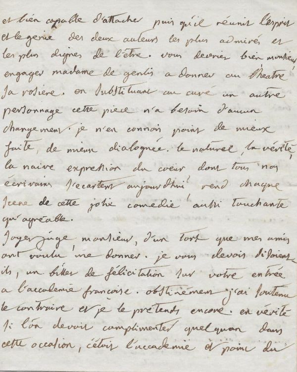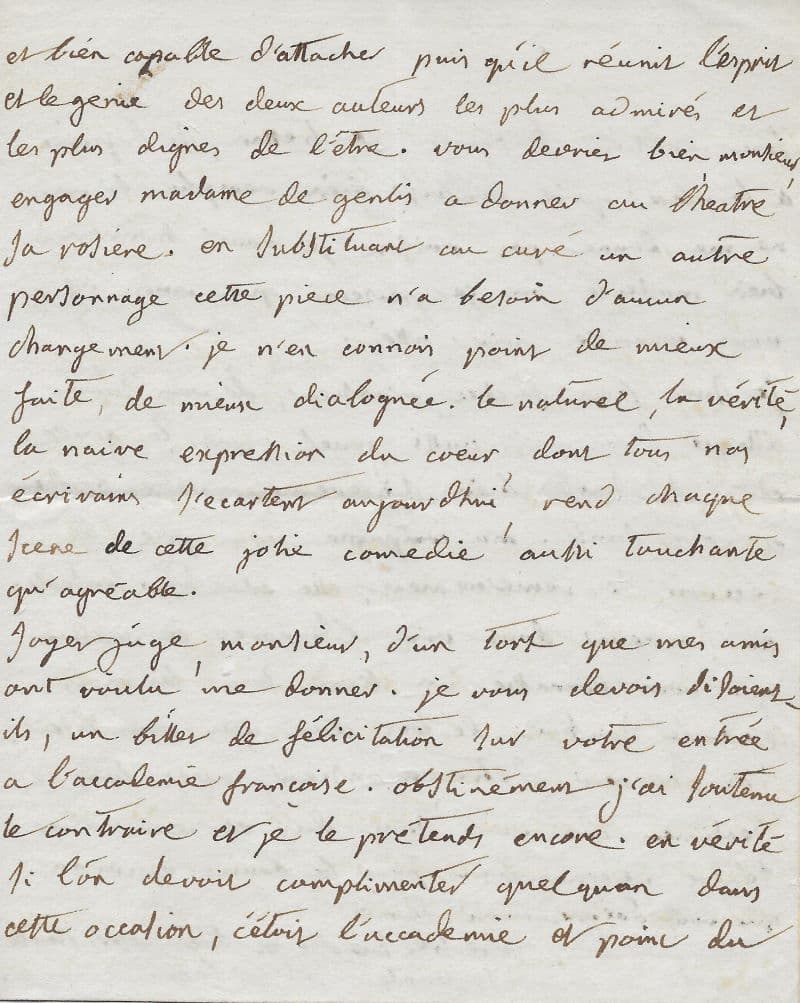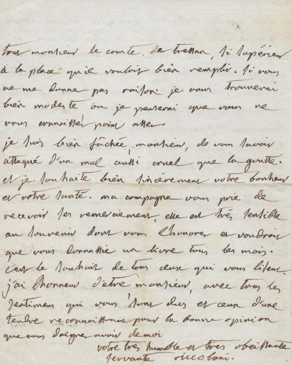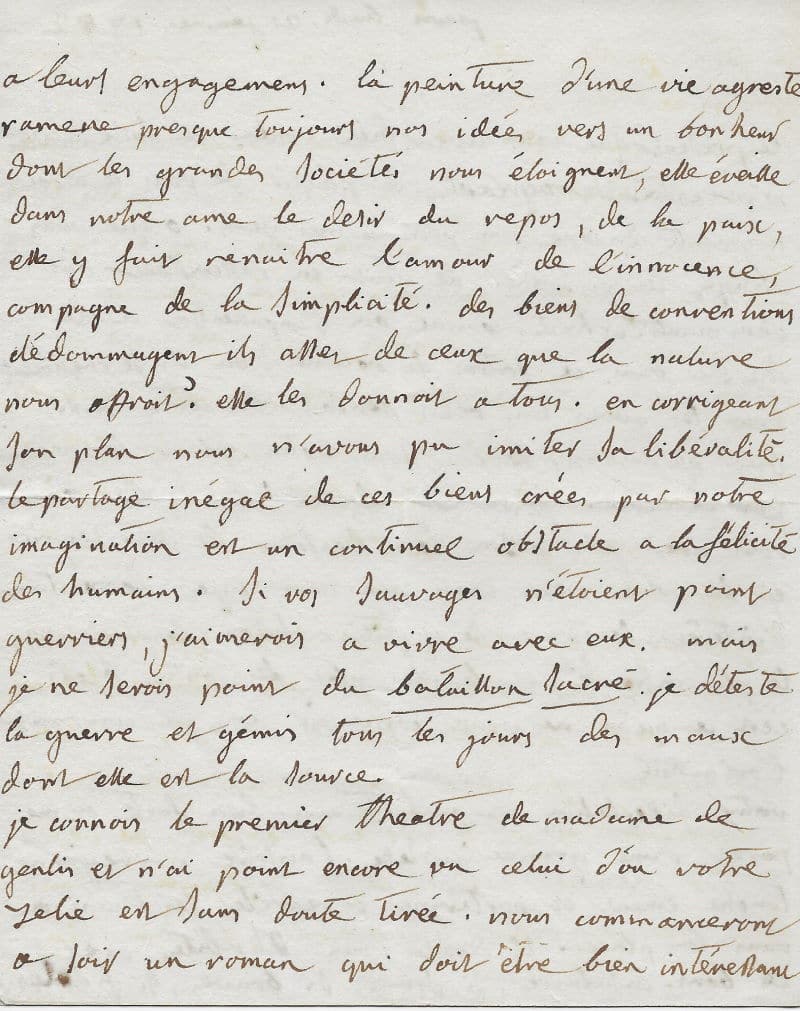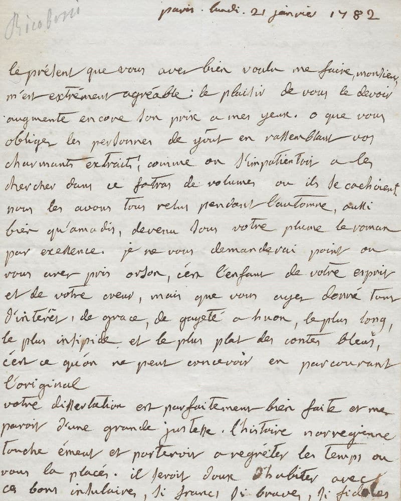 « Le présent que vous avez bien voulu me faire, Monsieur, est extrêment agréable : le plaisir de vous le devoir augmente encore son prix a mes yeux. O que vous obligez les personnes de goût en rassemblant vos charmants extraits ; comme on s’impatientait à les chercher dans ce fatras de volumes ou ils se cachaient. Nous les avons tous relus pendant l’automne, aussi bien qu’amadis, devenu sous votre plume le roman par excellence. Je ne vous demanderai point ou vous avez pris orson, c’est l’enfant de votre esprit et de votre cœur, mais que vous ayez donné tant d’intérêt, de grace, de gayeté a huon, le plus long, le plus insipide et le plus plat des contes bleus, c’est ce qu’on ne peut concevoir en parcourant l’original. Votre dissertation est parfaitement bien faite et me parait d’une grande justesse. L’histoire norvégienne touche émeut et porteroit a regreter les temps ou vous la placé. Il seroit doux d’habiter avec ces bons insulaires, si francs, si braves, si fidèles a leurs engagemens. La peinture d’une vie agreste ramene presque toujours nos idées vers un bonheur dont les grandes sociétés nous éloignent, elle éveille dans notre âme le desir du repos, de la paix, elle y fait renaitre l’amour de l’innocence, compagne de la simplicité. Des biens de conventions dédommageur ils (sont) de ceux que la nature nous offroit. Elle les donnoit à tous en corrigeant son plan nous n’avons pu imiter sa libéralité. Le partage inégal de ces biens créés pour notre imagination est un continuel obstacle a la félicité des humains. Si vos sauvages n’étoient point guerriers, j’aimerois a vivre avec eux. Mais je ne serois point du bataillon sacré. Je déteste la guerre et gémis tous les jours des maux dont elle est la source. Je connois le premier theatre de madame de Genlis et n’ai point encore vu celui d’où votre Selie est sans doute livrée. Nous commencerons a faire un roman qui doit être bien interessant et bien capable d’attache puis qu’il réunit l’esprit et le genie de deux auteurs les plus admirés et les plus dignes de l’être. Vous devriez bien, monsieur, engager madame de Genlis a donner au theatre sa rosiere en substituant au curé un autre personnage cette piece n’a besoin d’aucun changement. Je n’en connois point de mieux faite, de mieux dialoguée. Le naturel, la vérité, la naïve expression du cœur dont tous nos écrivains s’écartent aujourd’hui rend chaque scene de cette jolie comedie aussi touchante qu’agréable. Soyez juge, monsieur, d’un tort que mes amis ont voulu me donner. Je vous devais disaient-ils, un billet de félicitation sur votre entrée a l’accademie française. Obstinément j’ai soutenu le contraire et je le prétends encore. En vérité si l’on devoit complimenter quelqu’un dans cette occasion, c’étoit l’accademie et point du tout monsieur le comte de Tressan, si supérieur à la place qu’il vouloit bien remplir. Si vous ne me donnez pas raison je vous trouverai bien modeste ou je penserai que vous ne vous connoissez point assez. Je suis bien fâchée, monsieur, de vous savoir attaqué d’un mal aussi cruel que la goutte, et je souhaite bien sincèrement votre bonheur et votre santé. Ma compagne [son amie Thérèse qui l’accompagna jusqu’à la fin de sa vie] vous prie de recevoir ses remerciements, elle est très sensible au souvenir dont vous l’honorez et voudroit que vous donnassiez un livre tous les mois. C’est le souhait de tous ceux qui vous lisent… »