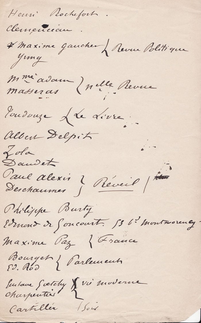 Liste de la main de Maupassant des critiques littéraires pour la promotion des « Comtes de la Bécasse » : « Rochefort, Clemenceau, Zola, Daudet, Paul Alexis, Mirbeau, Catulle, Wolff, Barbey d’Aurevilly, etc… »