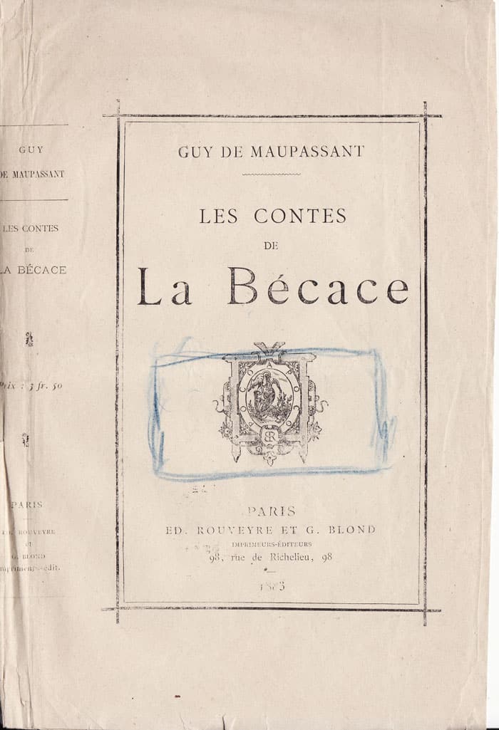 Lettres à son éditeur Rouveyre, billet à ordre, contrat d’édition des Contes de la Bécasse, liste du service de presse, épreuve du titre, quelques pages des Contes de la Bécasse