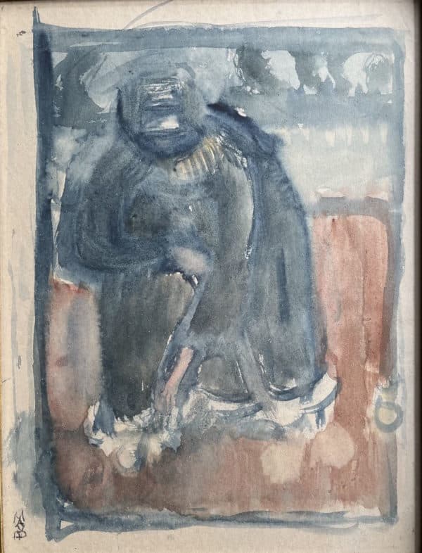 Scène intimiste, représentant une femme un genou à terre. Charmant dessin aux larges aplats de couleurs chaudes propre au nabisme. Ici tout n’est que volume sans contour défini, seule la couleur crée l’objet.