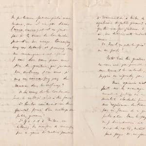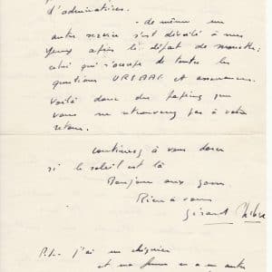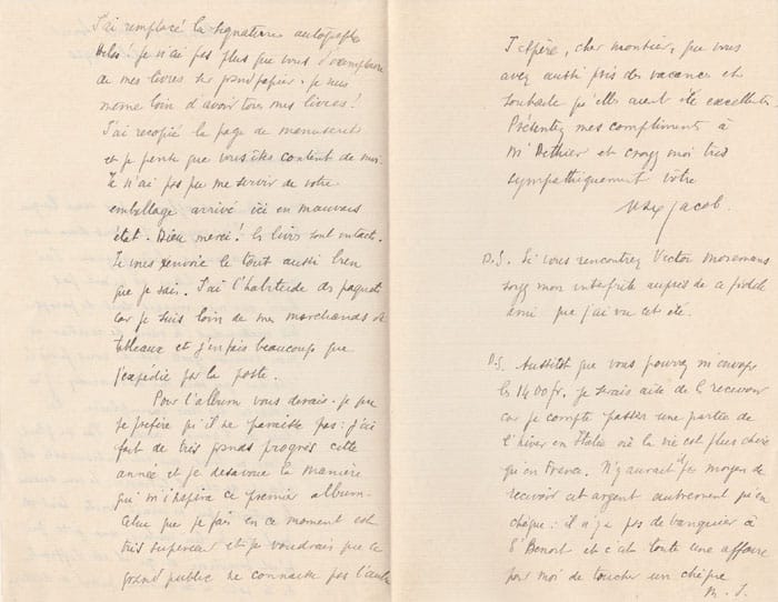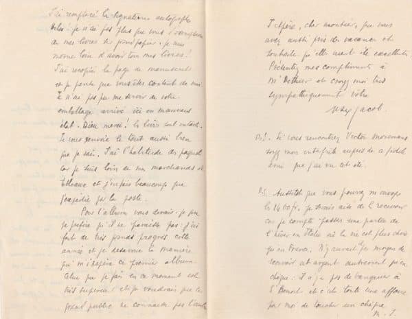Max Jacob n’a pas répondu à ses lettres car il était en vacances « mes voyages sont des paraphes très inattendus ». Maintenant qu’il est rentré « mon premier geste est de vous faire les plaisirs que vous me demandez : j’ai dédicacé les trois exemplaires, le « livre de l’aimé » aussi. (…) Je vois encore le portrait qui m’avait coûté tant de mal car je lui voulais une pose qui m’est familière et qu’il est difficile de se poser à soi même quand on dessine. J’ai remplacé la signature autographe hélas ! Je n’ai pas plus que vous l’exemplaire de mes livres sur grand papier. Je suis même loin d’avoir tous mes livres ! J’ai recopié la page de manuscrit et je pense que vous êtes content de moi. ». Il lui envoie ses livres : « J’ai l’habitude des paquets car je suis loin de mes marchands de tableaux et j’en fais beaucoup que j’expédie par la poste ». Cependant il ne souhaite pas que l’album paraisse car il a « fait de très grands progrès cette année et je désavoue la manière qui m’inspira ce premier album. Celui que je fais en ce moment est très supérieur et je voudrais que le grand public ne connaisse pas l’autre ». Il lui rappelle en post-scriptum : « Aussitôt que vous pourrez m’envoyer les 1400 fr je serais acte de les recevoir car je compte passer une partie de l’hiver en Italie où la vie est plus chère qu’en France. N’y aurait il pas moyen de recevoir cet argent autrement qu’en chèque : il n’ya pas de banquier à St Benoît et c’est toute une affaire pour moi de toucher un chèque »