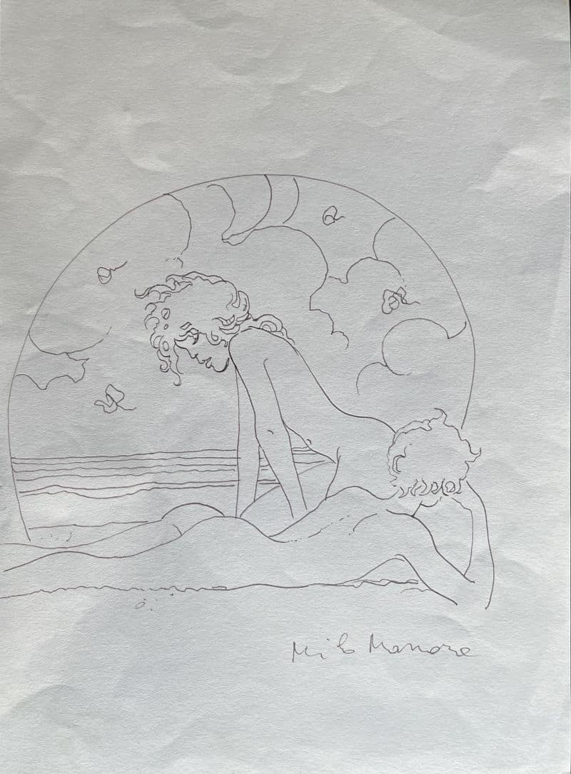 Joli dessin à l’encre signé, 29,1 x 21 cm, représentant deux jeunes filles allongées nues, au bord de la plage, dans un décor enchanteur.