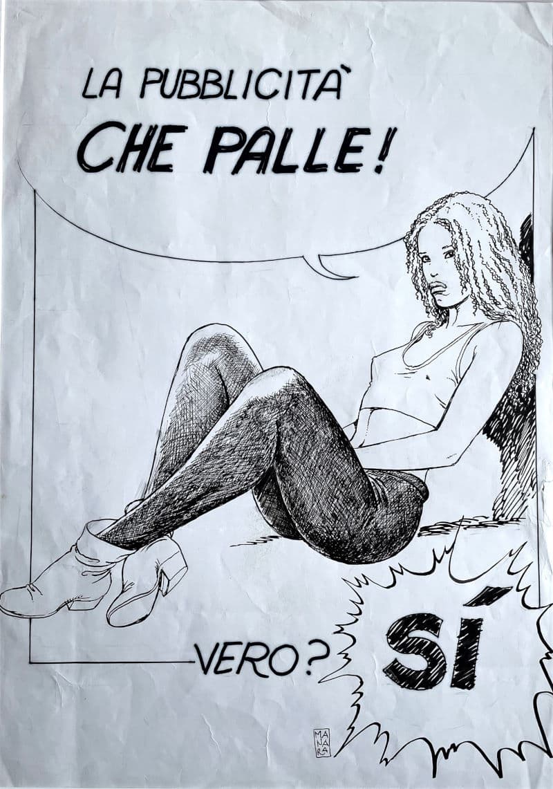 Illustration du maître de l’érotisme présentant une jeune fille à la moue boudeuse déclarant dépitée que la publicité c’est nul. L’auteur lui répond : « vraiment ? »… « Oui ».