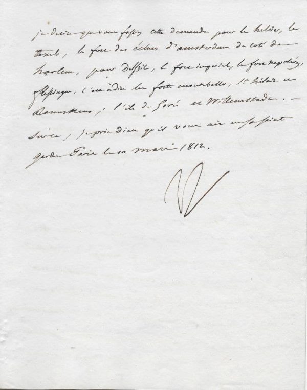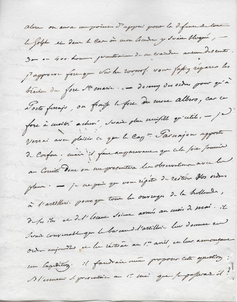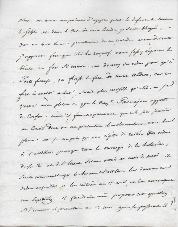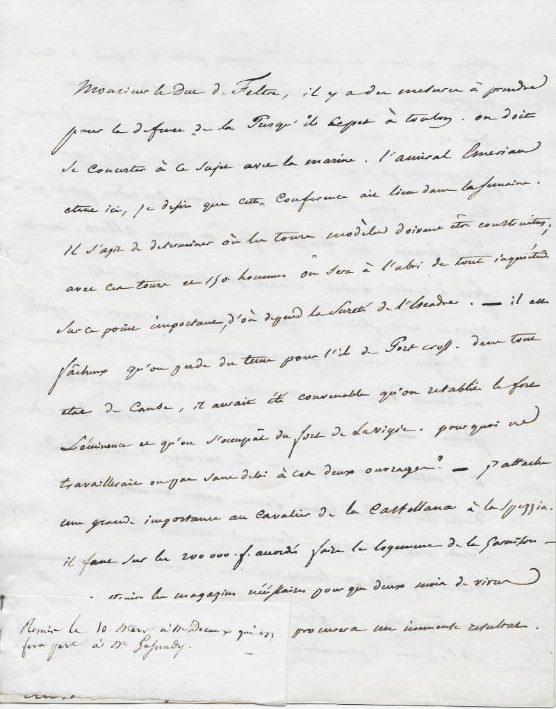 Belle lettre sur les chantiers entrepris pour la défense de l’empire. Napoléon ordonne la construction immédiate des tours modèles pour la défense de la rade de Toulon dans le cas d’une attaque anglaise, de l’île de port Cros, le rétablissement des forts de la Vigie, du mont Albero, la protection de la Hollande : « Il y a des mesures à prendre pour la défense de la Presqu’ile Cépet à Toulon. On doit se concerter à ce sujet avec la marine. L’amiral Emeriau [l’officier de marine Maxime Julien Émeriau de Beauverger] étant ici, je désire que cette conférence ait lieu dans la semaine. Il s’agit de déterminer où les tours modèles doivent être construite ; avec ces tours et 150 hommes on sera à l’abri de toutes inquiétudes sur ce point important, d’où dépend la sureté de l’escadre. Il est fâcheux qu’on perde du tems pour l’ile de Port Cros. Dans tout état de cause, il aurait été convenable qu’on rétablit le fort L’éminence et qu’on s’occupa du fort de La vigie. Pourquoi ne travaillerait on pas sans délai à ces deux ouvrages ? J’attache une grande importance au cavalier de la Castellana à la Spezzia. Il faut sur les 200 000 f. accordés faire le logement de la garnison et contenir les magazins militaires pour que deux mois de vivre puissent y être renfermés. Cela procurera un immense résultat alors on aura un point d’appui pour la défense pour tout le golphe et dans le cas où mon escadre y serait bloquée, 300 ou 400 hommes permettraient de ne craindre aucune descente. J’approuve fort que sur les 200 000 f. vous fassiez réparer les brèches du fort Ste Marie. Donnez des ordres pour qu’à Porto Ferrajo, on finisse le fort du mont Albero, car ce fort à moitié achevé serait plus nuisible qu’utile, je verrai avec plaisir ce que le Cap(itai)ne Parnajon apporte de Corfou. Mais il faut auparavant que cela soit soumis au Comité dont on me présentera les observations avec les plans. Je ne puis que vous répéter de réitérer vos ordres à l’artillerie pour que tous les ouvrages de la Hollande, de ses iles, et de l’Escaut soient assurés au mois de mai. Il serait convenable que le bureau de l’artillerie leur donnât un ordre aujourd’hui et la réitérât au 1er avril, en leur annonçant une expédition. Il faudrait même proposer cette question : Si l’ennemi se présentait au 1er mai que se passerait il ? Je décide que vous fassiez cette demande pour le Helder, le Texel, le fort des écluses d’Amsterdam du côté de Harlem, pour Delfzil, le fort impérial, le fort Napoléon, Fressingue, c’est-à-dire les forts moins stable (…) »