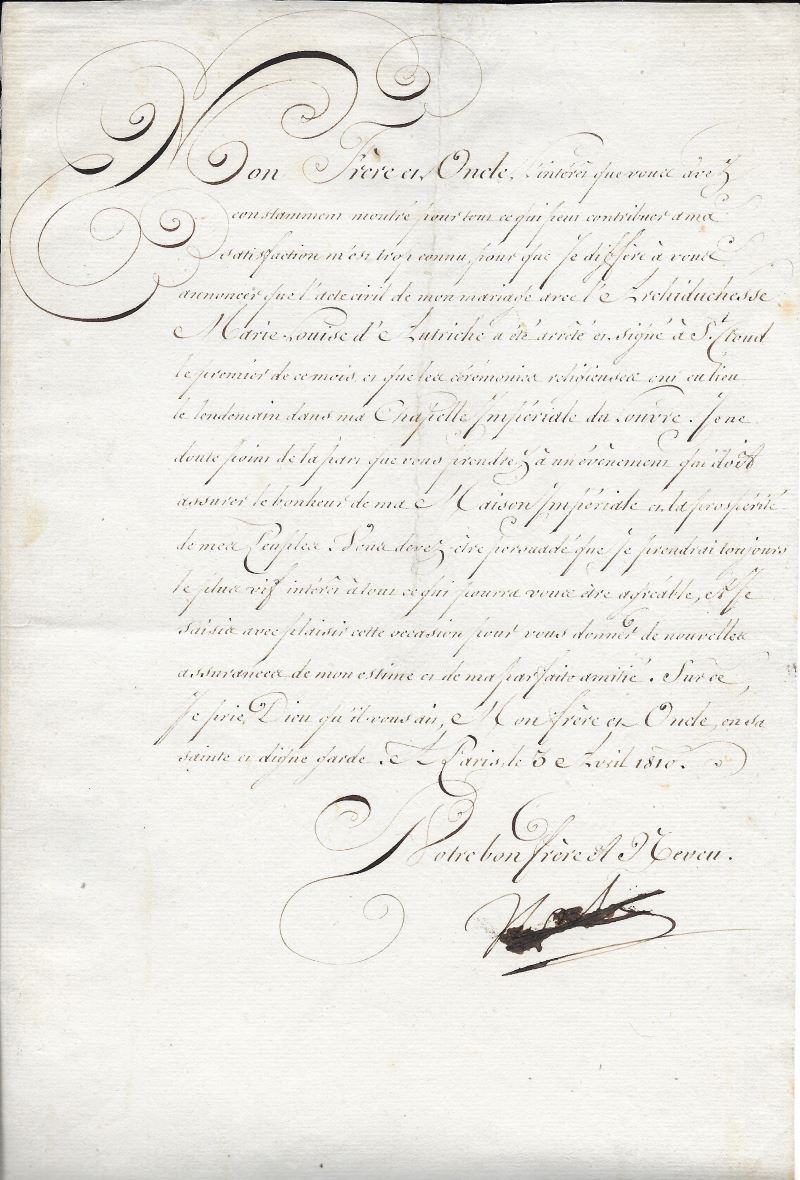Napoléon annonce en personne son mariage avec l’archiduchesse Marie-Louise d’Autriche, au grand-duc de Wurtzbourg, titre concédé par Napoléon en 1805 suite au traité de Presbourg.: « Mon Frère et Oncle, L’intérêt que vous avez constamment montré pour tout ce qui peut contribuer à ma satisfaction m’est trop connu pour que je diffère à vous annoncer que l’acte civil de mon mariage avec l’Archiduchesse Marie-Louise d’Autriche a été arrêté et signé à St Cloud le premier de ce mois et que les cérémonies religieuses ont eu lieu le lendemain dans ma Chapelle Impériale du Louvre. Je ne doute point de la part que vous prendrez à un évènement qui doit assurer le bonheur de ma Maison Impériale et la prospérité de mon Empire. Vous devez être persuadé que je prendrai toujours le plus vif intérêt à tout ce qui pourra vous être agréable et je saisis avec plaisir cette occasion pour vous donner de nouvelles assurances de mon estime et de ma parfaite amitié »