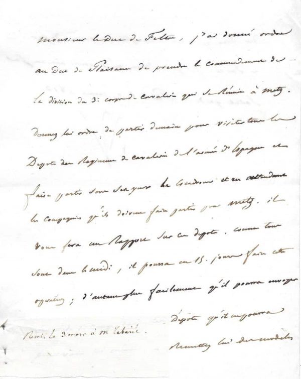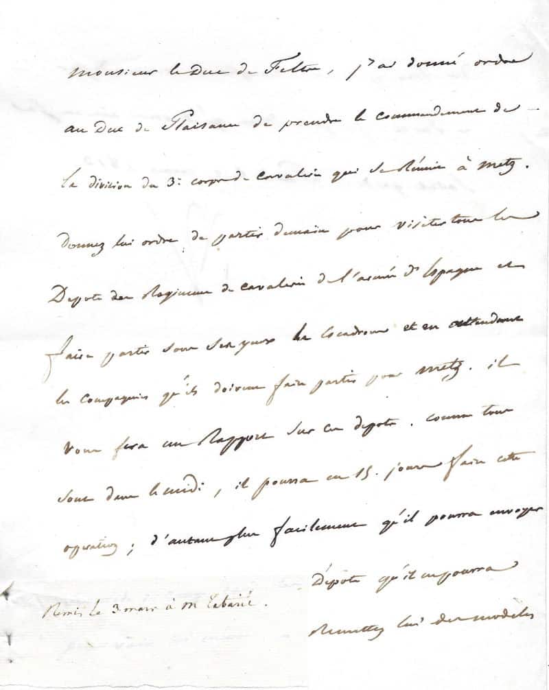 L’empereur organise la division du 3ème corps de cavalerie à Metz sous le commandement du duc de Plaisance (le général Lebrun) et demande des renseignements sur les dépôts des régiments de cavalerie de l’armée d’Espagne : « Monsieur le Duc de Feltre, j’ai donné ordre au duc de Plaisance de prendre le commandement de la division du 3e corps de cavalerie qui se réuni à Metz. Donnez lui ordre de partir demain pour visiter tout le dépôt du régiment de cavalerie de l’armée d’Espagne (…) Il vous fera un rapport sur ce dépôt. Comme tous sont dans le midi, il pourra en 15 jours faire cette opération ; d’autant plus facilement qu’il pourra envoyer son aide de camp dans les dépôts qu’il ne pourra pas voir lui-même. Remettez lui des modèles des états qu’il devra remplir et vous adresser (…) »
