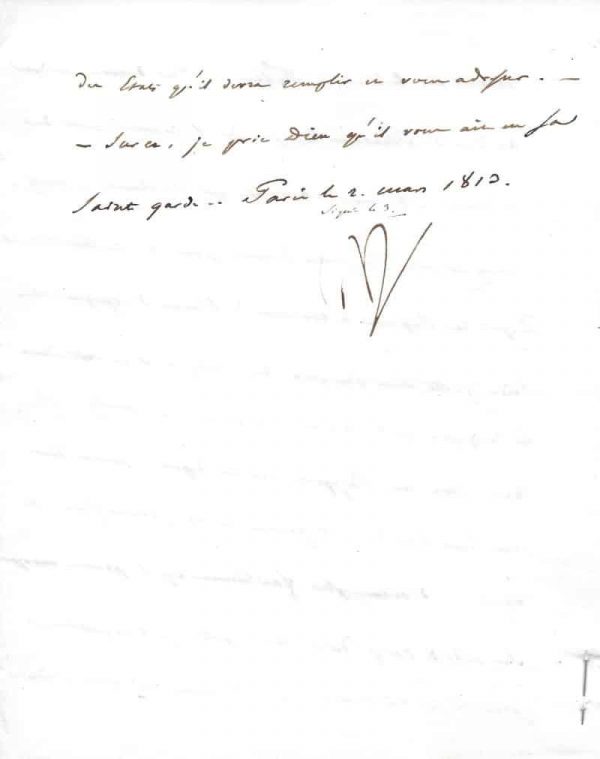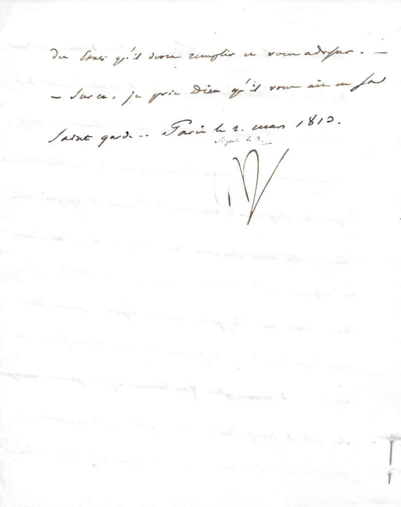 Lettre signée « Np » rédigée par le baron Fain au duc de Feltre. Paris 2 mars 1813 ; 1 page 1/3 in-4° avec billet d’accusé de réception épinglé.