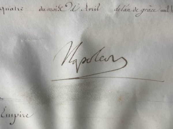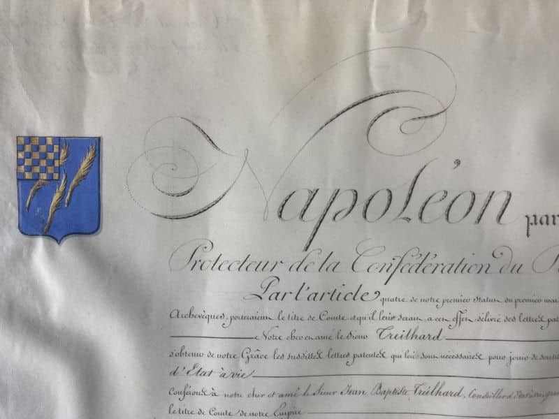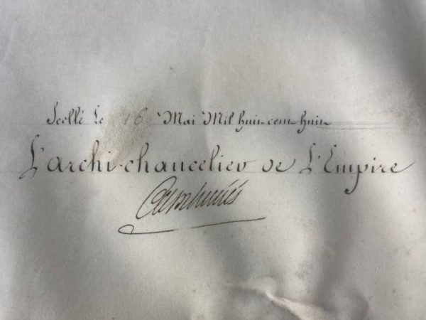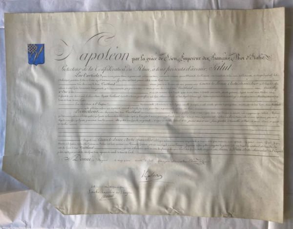 Superbe brevet de noblesse, 47 x 63 cm, décernant le titre de Comte de l’empire à Jean-Baptiste Treilhard, illustré des armoiries peintes de ce dernier en haut à gauche du brevet. Belle signature pleine et entière de Napoléon et de Jean-Jacques-Régis de Cambacérès avec mention du scellé au 16 mai 1808. Au dos, indication de l’enregistrement du titre aux registres du sénat le 20 mai 1808, signée par le chancelier du sénat Pierre-Simon de Laplace.