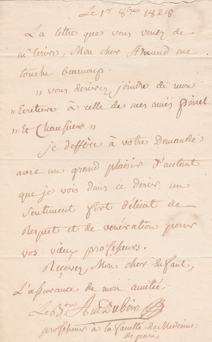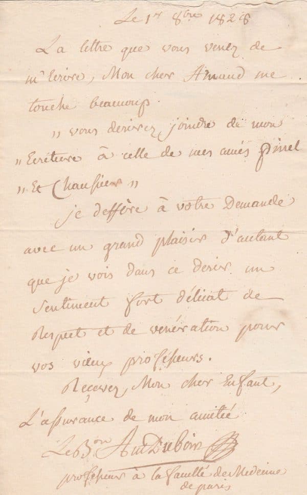 Lettre autographe signée à son ancien élève Arnaud en tant que professeur à la faculté de Médecine de Paris. 1er octobre 1828 ; 1 page in-8°