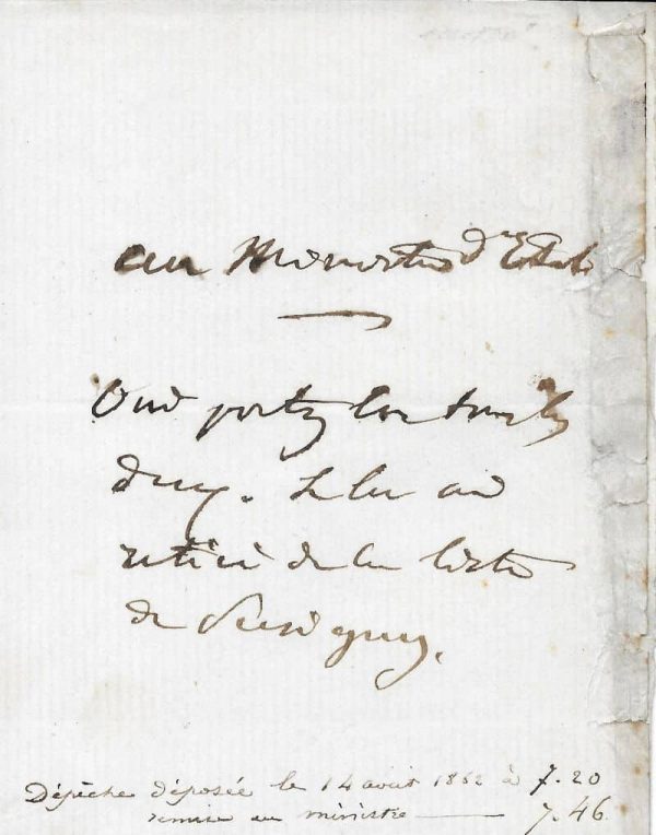 Billet autographe au ministre d’Etat. 14 août 1862; 1 p in-12°. Effrangé