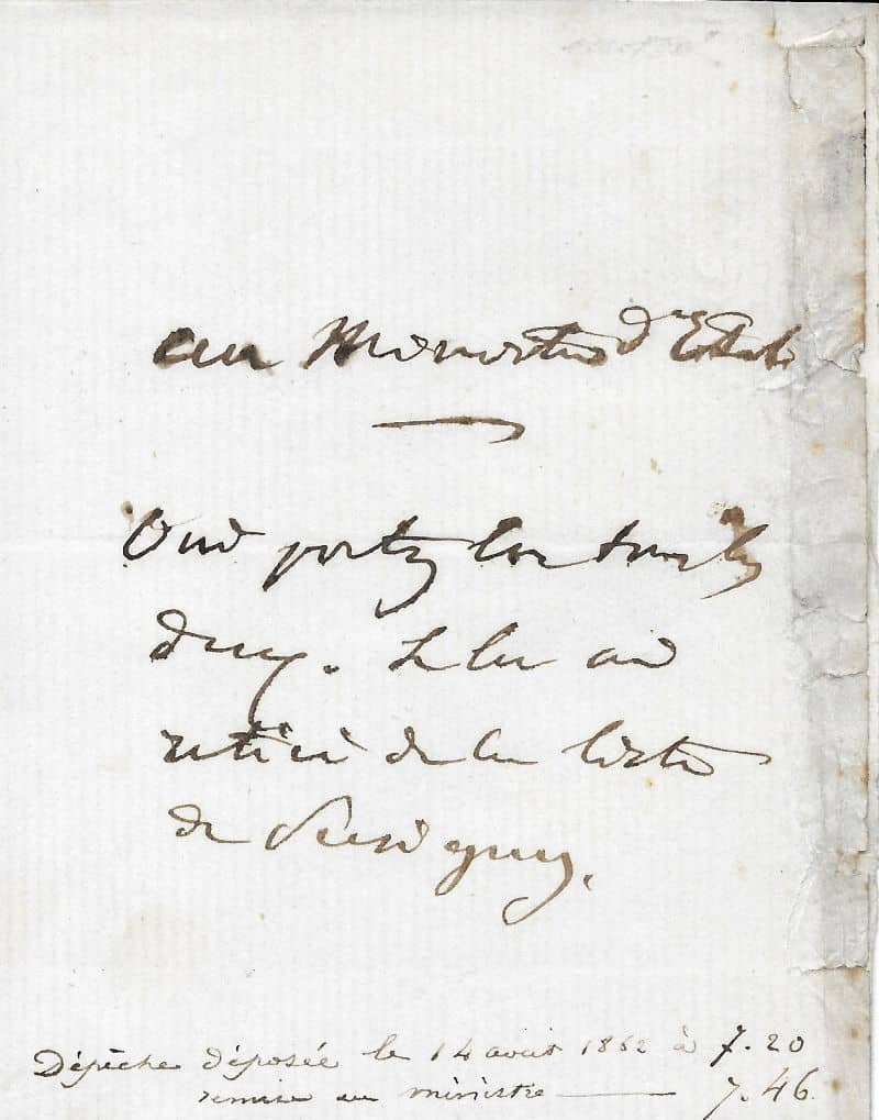 Dépêche adressée au ministre d’Etat déposée le 14 avril 1862 à 7h20 et remise au ministre à 7h46 : « Portez la tous les deux. Je la ai retirée de la liste de Pusigny »