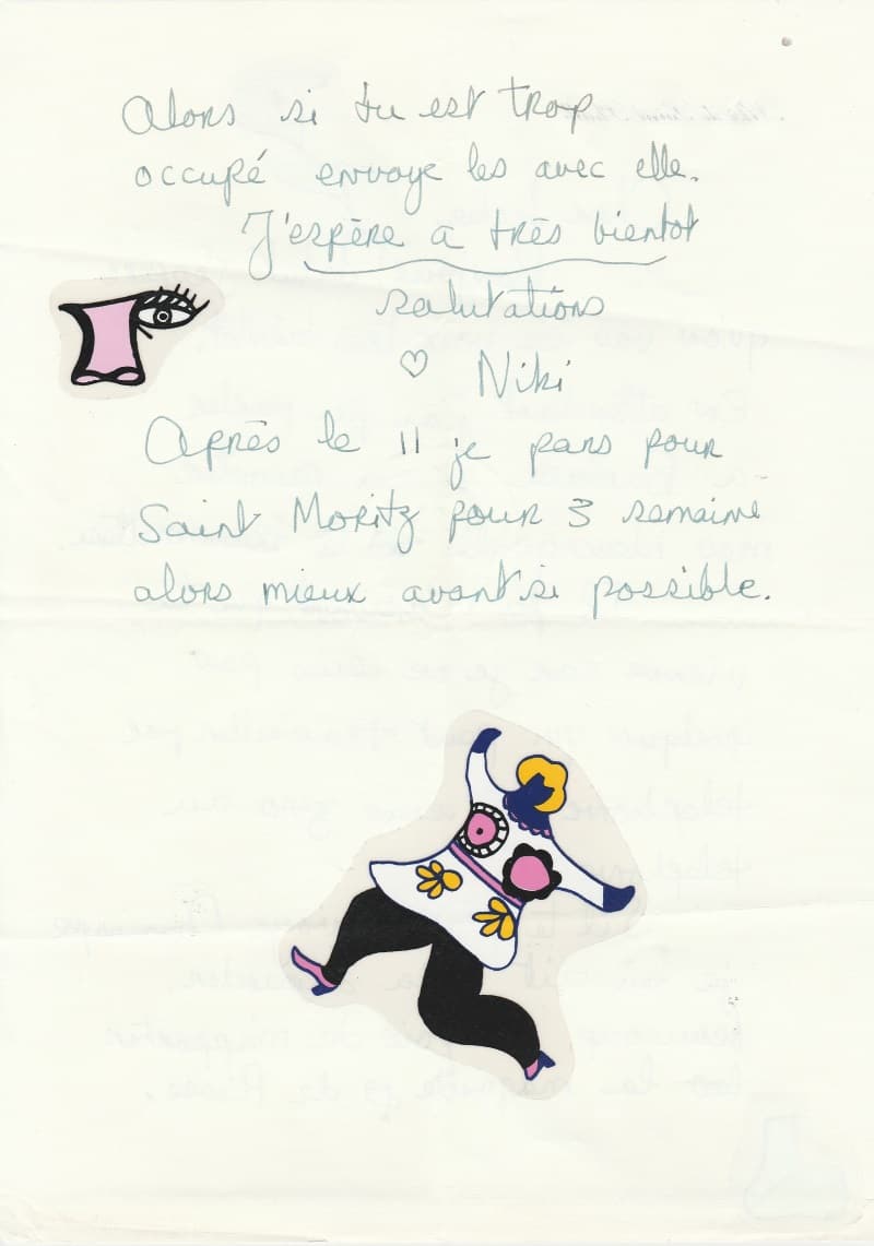 Rare lettre de l’artiste concernant le lancement de son nouveau parfum qui sera commercialisé en 1982 dans une cinquantaine de pays : « (…) j’ai pu parler a Barbara et lui raconter mes idées qu’elle te transmettra. Il faut vraiment que tu vienne car je ne suis pas quelqu’un qui peut travailler par téléphone. Je suis zéro au téléphone. S’il te plait envoye Dominique je lui ait déjà demander beaucoup de fois de m’apporter la maquette de Presse. Alors si tu est trop occupé envoye les avec elle. J’espère à très bientôt. Salutations Niki (…) »