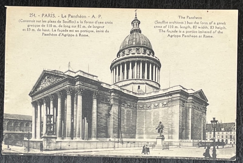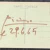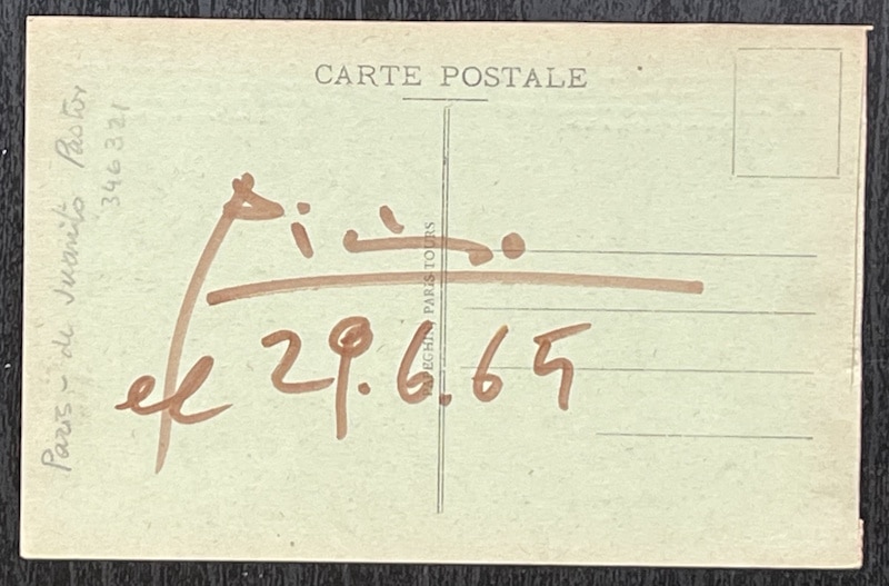 Carte postale représentant le Panthéon à Paris dans les années 60. Dimensions : 9 x 14 cm. Au dos de la carte signature autographe et date (el 29.6.65) au feutre marron de Pablo Picasso. Mention en marge au crayon à papier du propriétaire d’origine (Juanito Pastor).