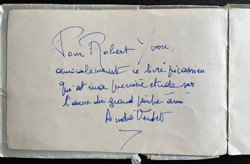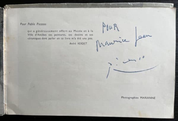 Tout premier catalogue du musée Picasso d’Antibes, daté de 1951, avant son inauguration officielle en 1966. Catalogue enrichi d’une dédicace de Pablo Picasso à Maurice Jean, fondateur du Bridge club d’Antibes. Autres dédicaces à l’intérieur de l’ouvrage du gardien du musée, Monsieur Pelligrini, ainsi qu’en page de garde d’André Verdet à Robert Yvon, ancien journaliste au quotidien Nice Matin.